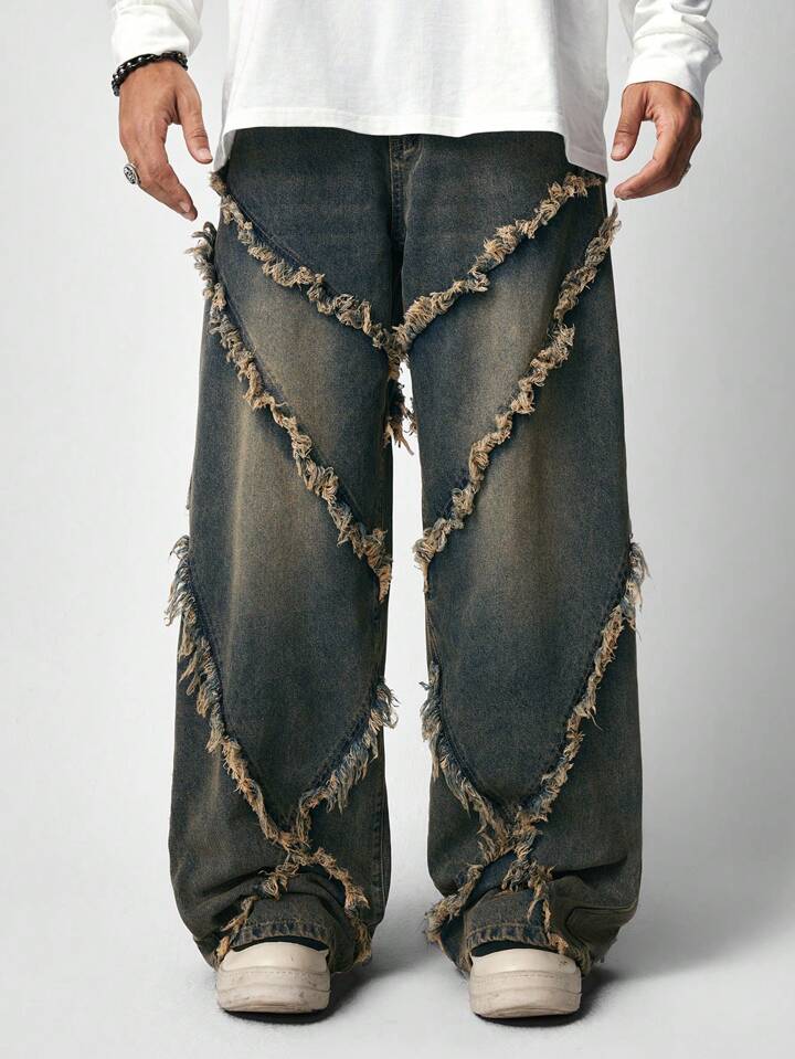 Street Life Men's Frayed Pocket Wide Leg Loose Casual Patchwork Jeans