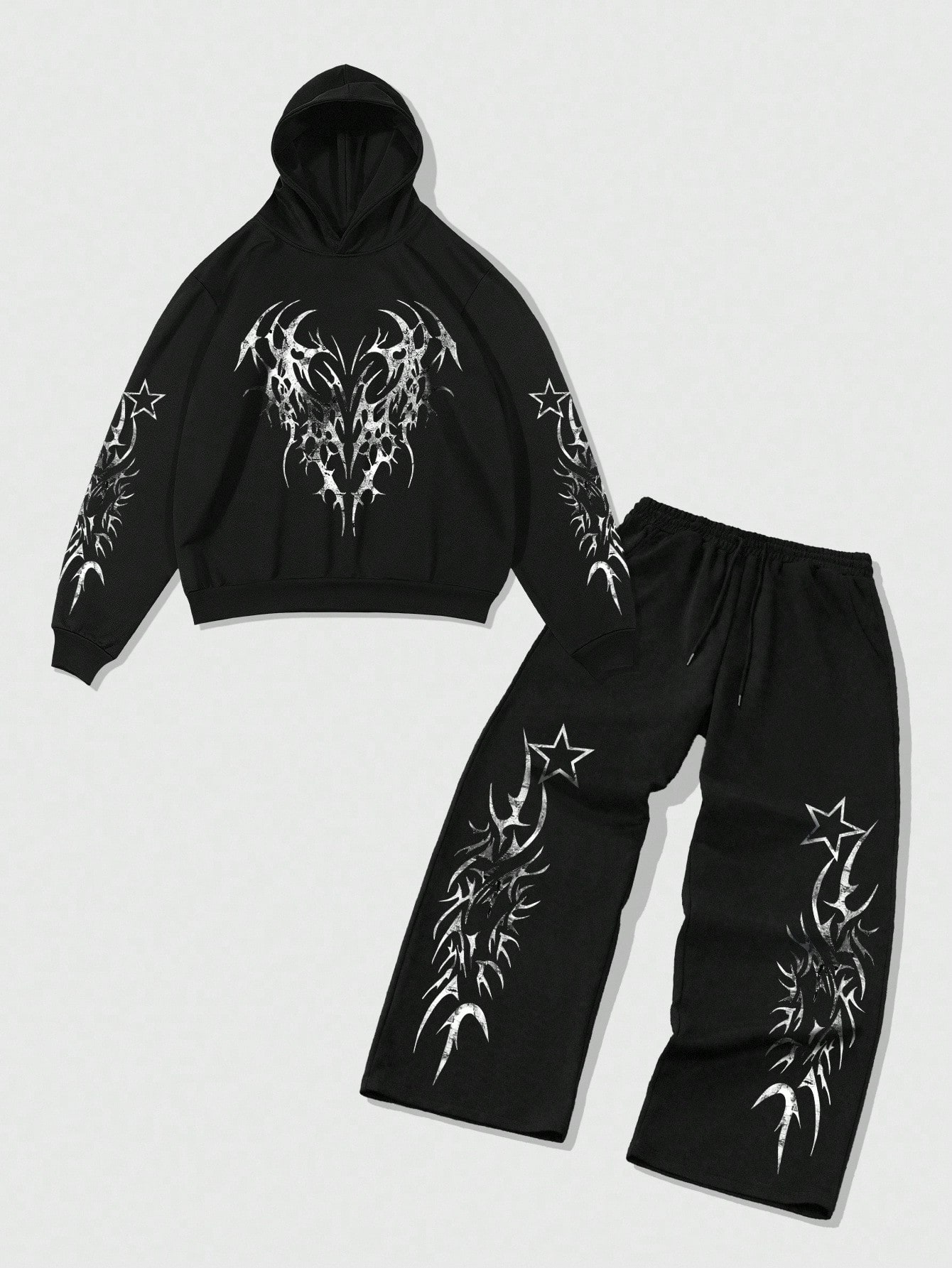 Street Life Men's Gothic Print Long Sleeve Hoodie And Loose Straight Leg Pants Set