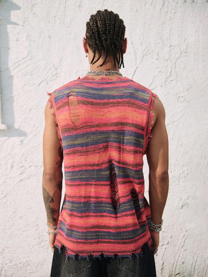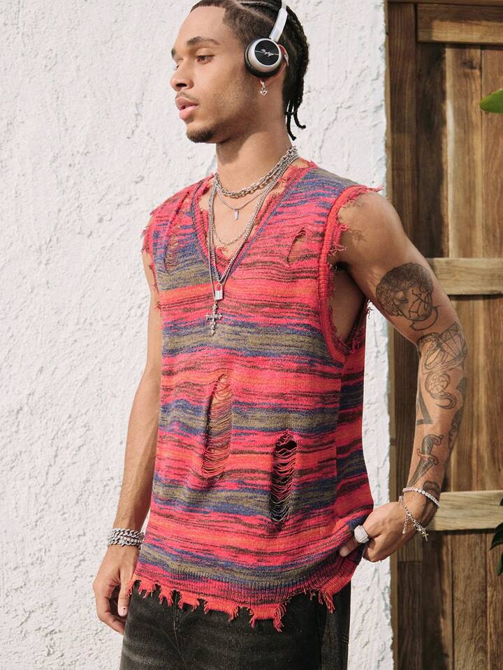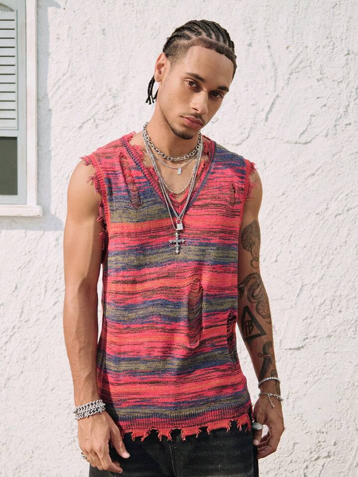 Street Life Men's Gradient Distressed V-Neck Sleeveless Casual Top, Suitable For Everyday Wear Vacation