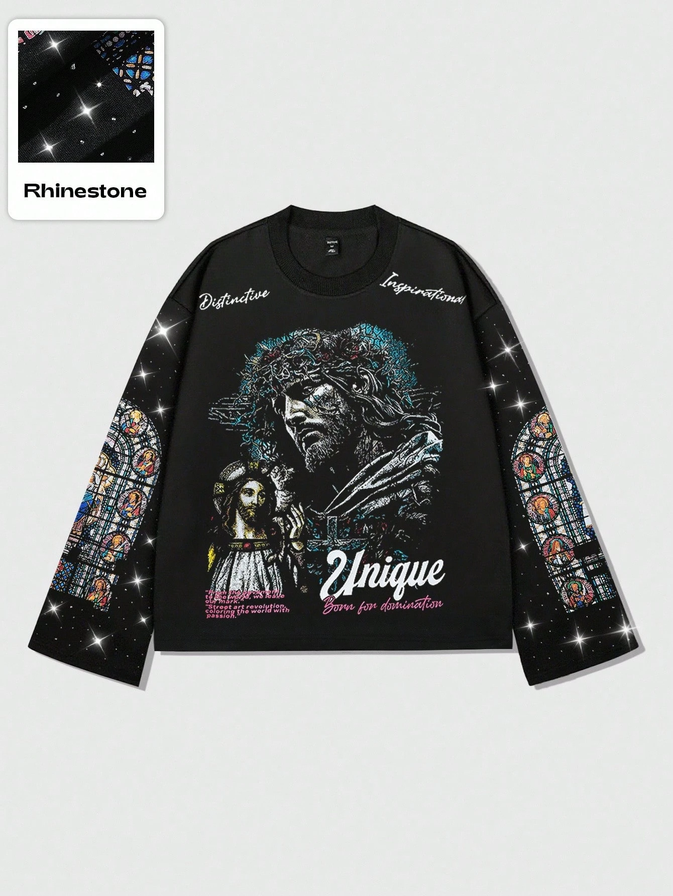 Street Life Men's Graphic Gothic Jesus Print Rhinestone Decor Crew Neck Loose Fit Casual Pullover Sweatshirt, For Fall