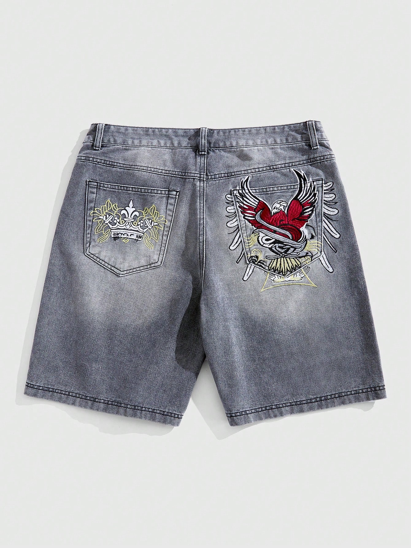 Street Life Men's Grunge Eagle Embroidery Pocketed Casual Versatile Denim Shorts