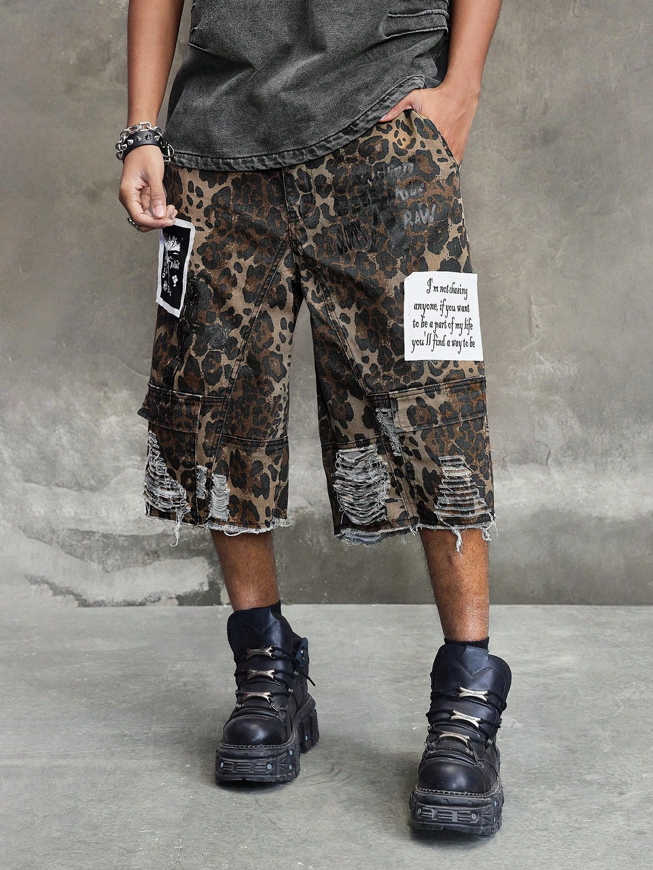 Street Life Men's Grunge Leopard Print Slogan Decoration Loose Casual Denim Cargo Shorts