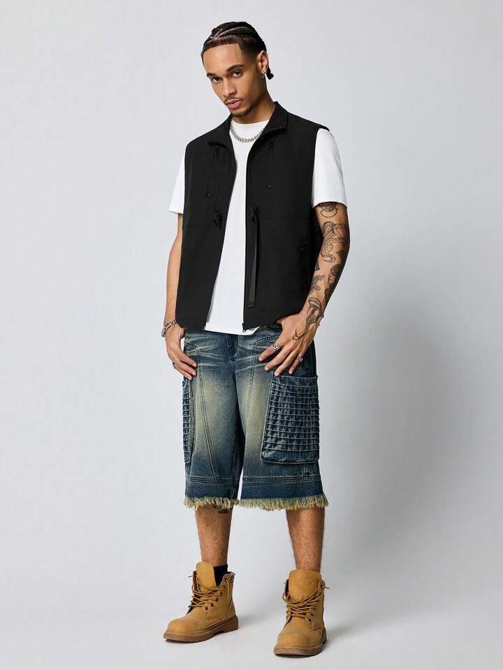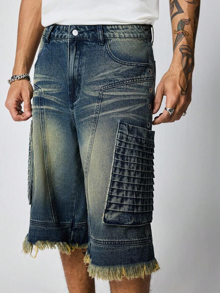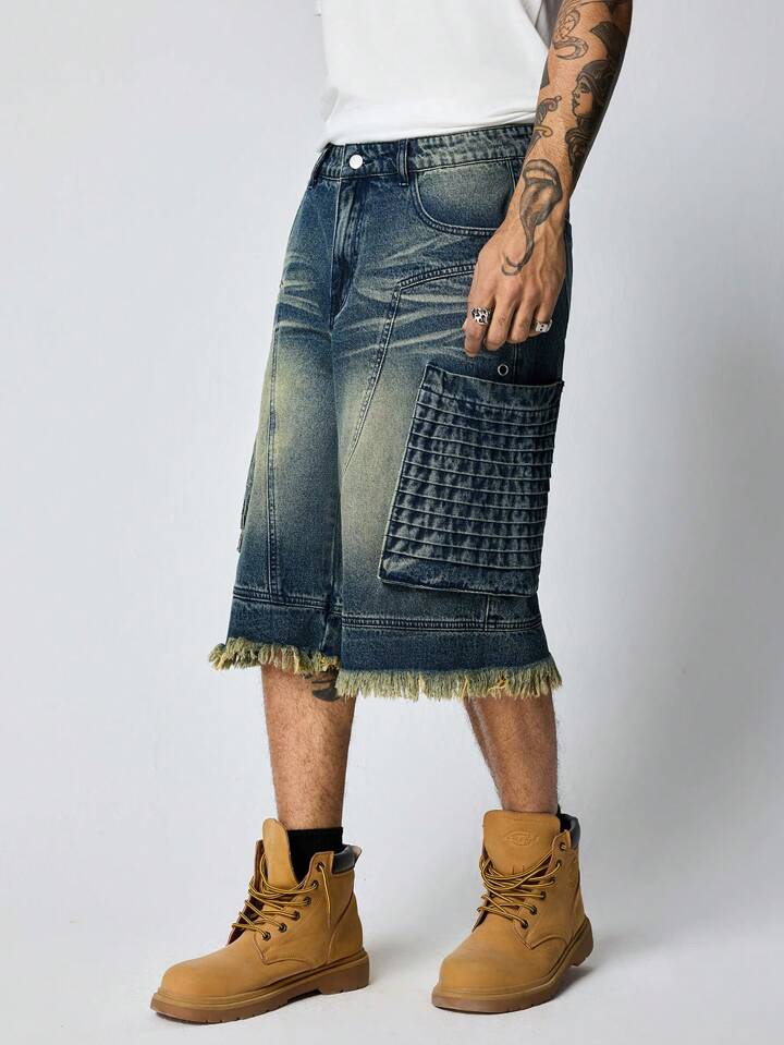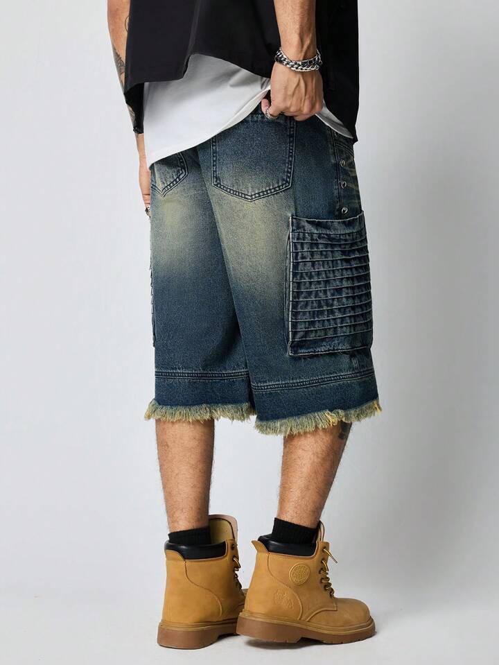 Street Life Men's Grunge Pocket Raw Hem Loose Casual Denim Shorts
