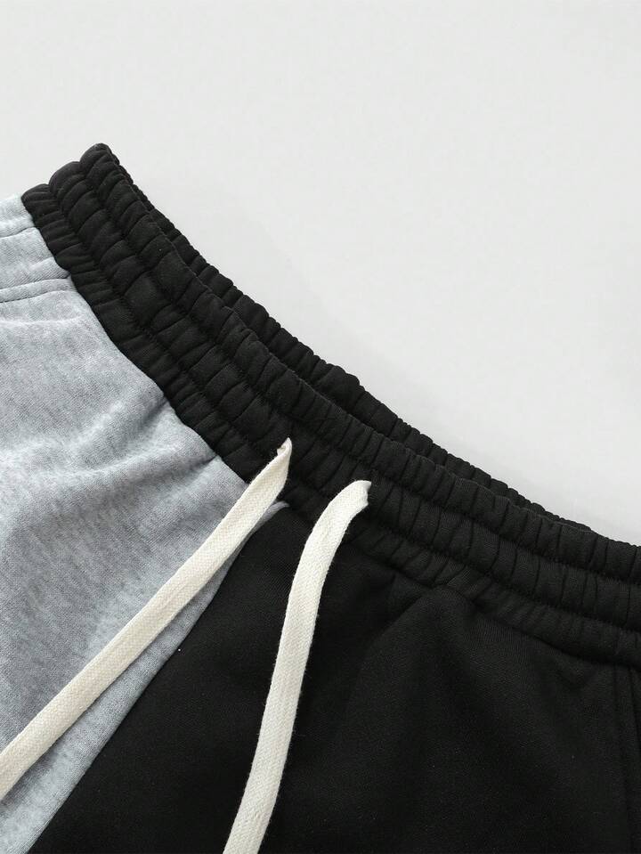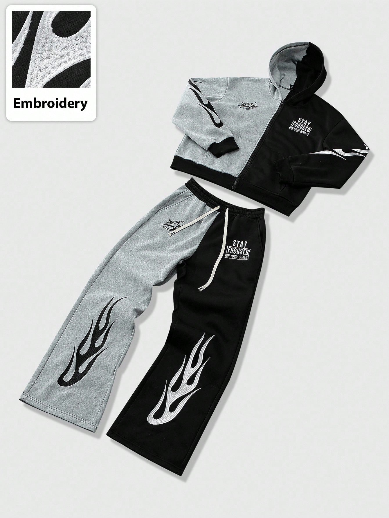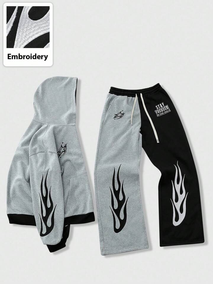 Street Life Men's Hooded Sweatsuit, Casual Street Style American Flame Patch Embroidery Colorblock Hoodie Set, Autumn/Winter