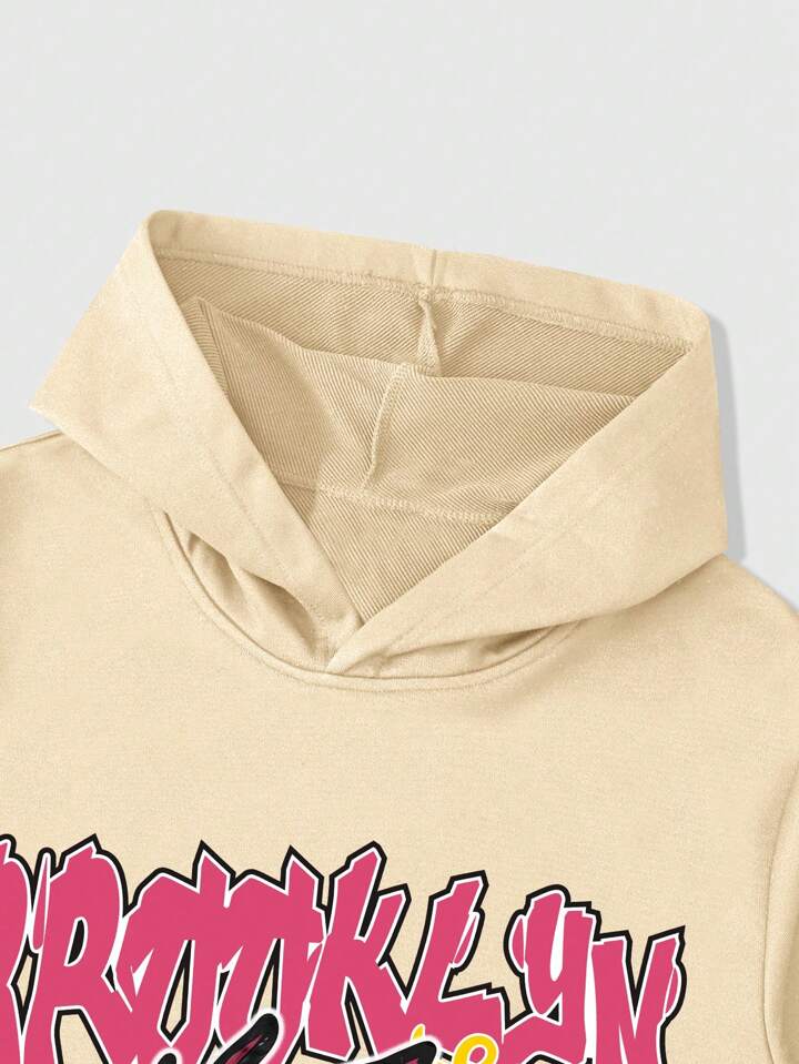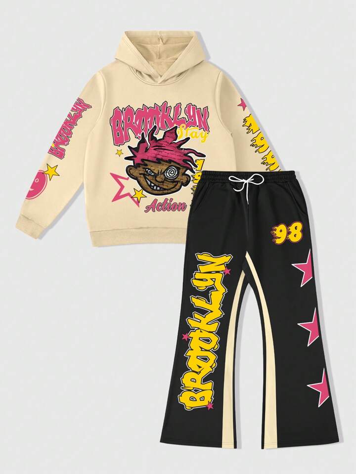 Street Life Men's Letter & Cartoon Print Hooded Sweatshirt And Sweatpants Casual Loose Fit Set, Fall/Winter