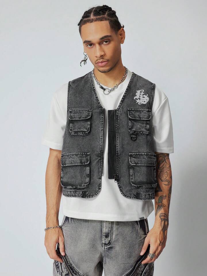 Street Life Men's Letter Print Utility Pocket Casual Vest/Jacket