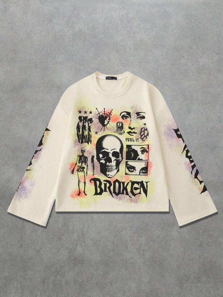 Street Life Men's Letter & Skull Print Crew Neck Loose Casual Long Sleeve T-Shirt, Fall