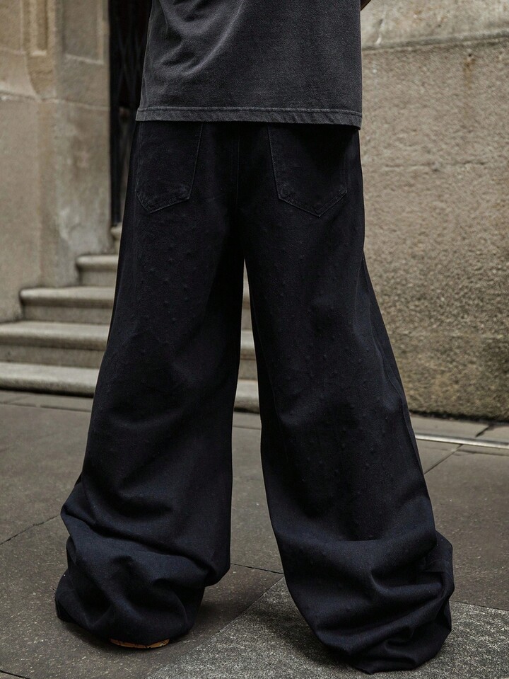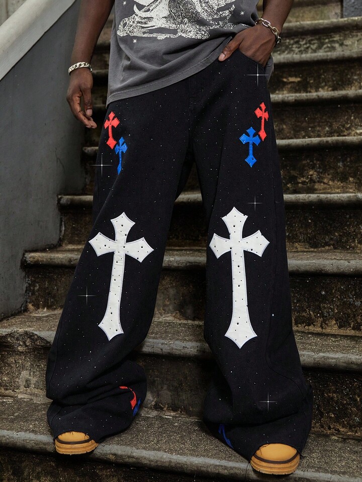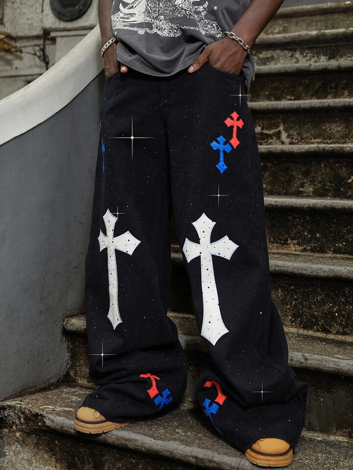 Street Life Men's Loose Fit Rhinestone Cross Embellished Denim Jeans, Grunge