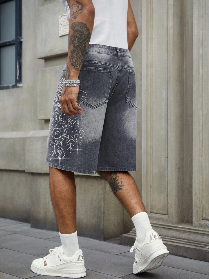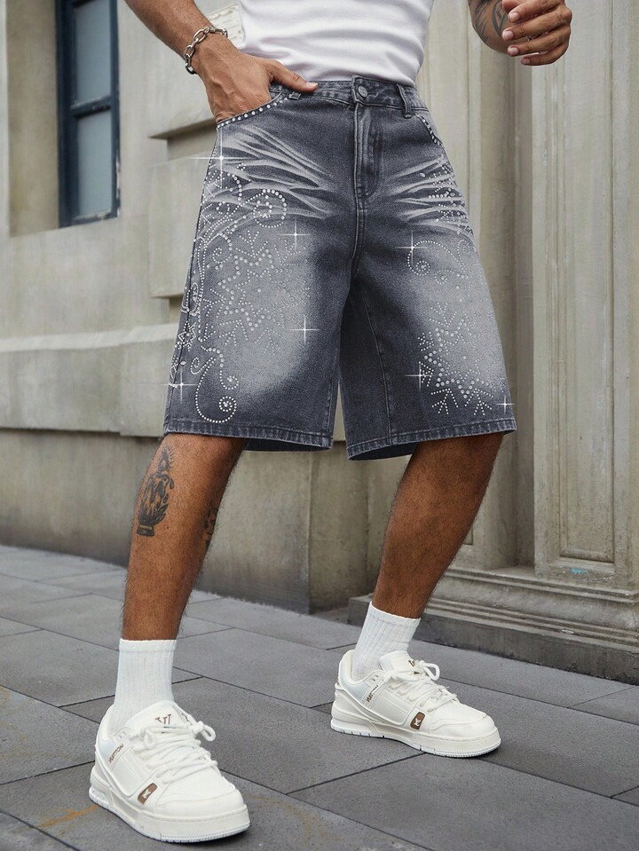 Street Life Men's Loose Fit Rhinestone Embellished Denim Shorts
