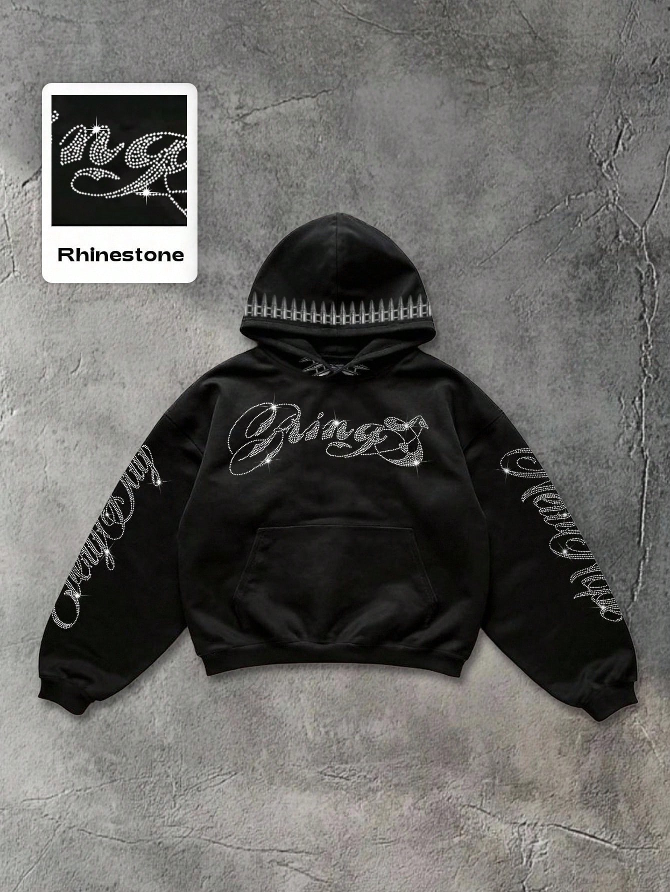 Street Life Men's Loose Fit Rhinestone Graphic Black Hoodie Sweatshirt, Fall
