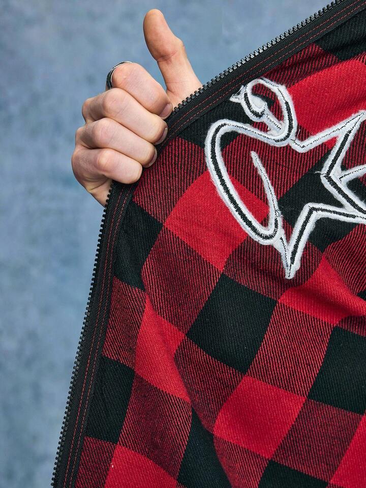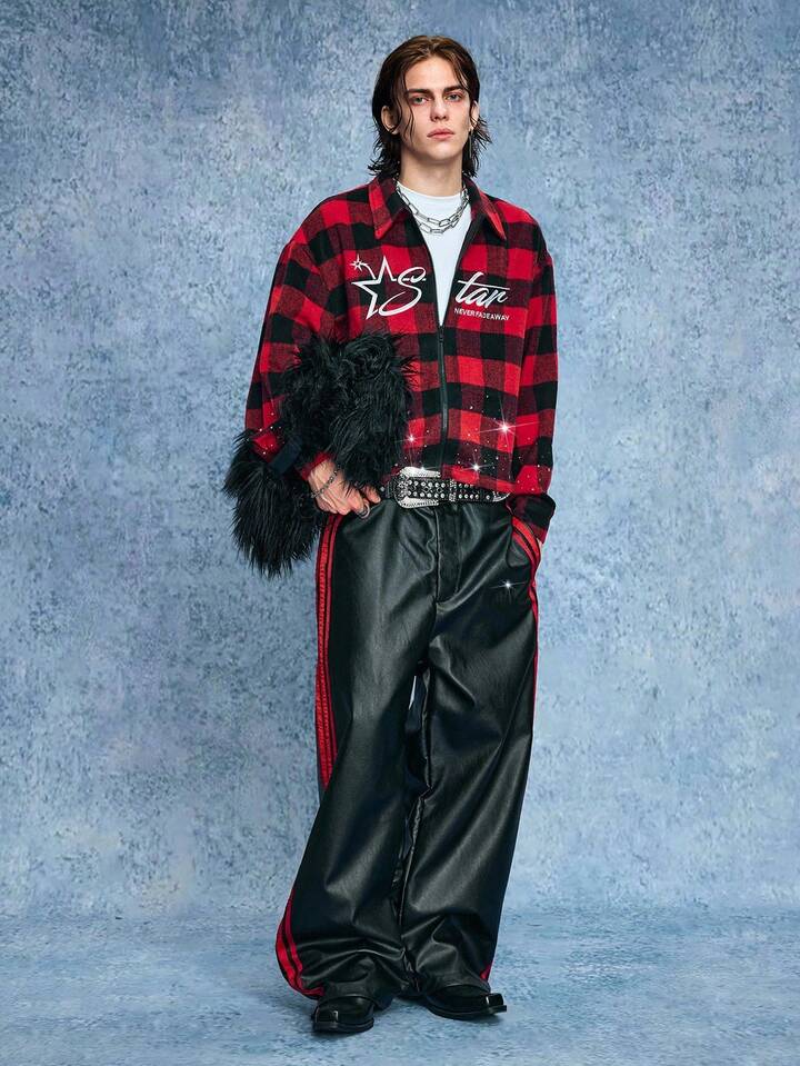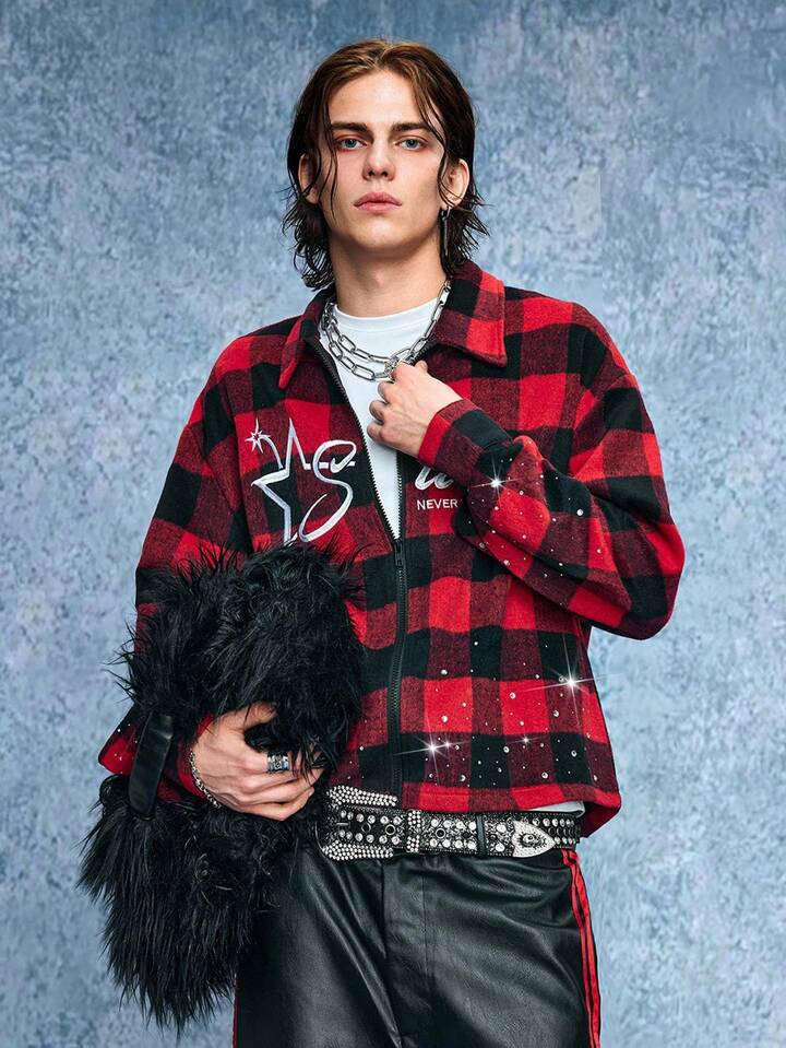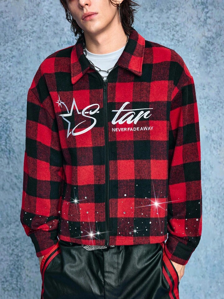 Street Life Men's Plaid Letter Embroidery Rhinestone Wool Blend Overcoat, Fall/Winter