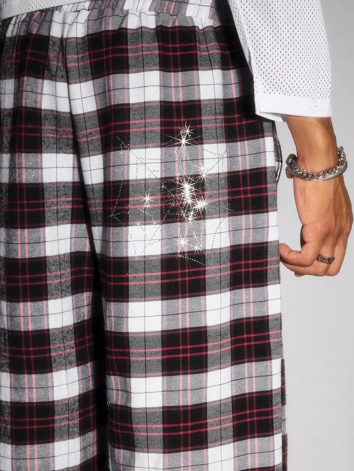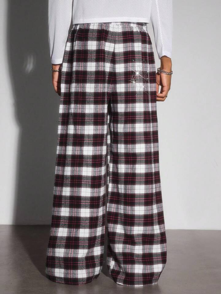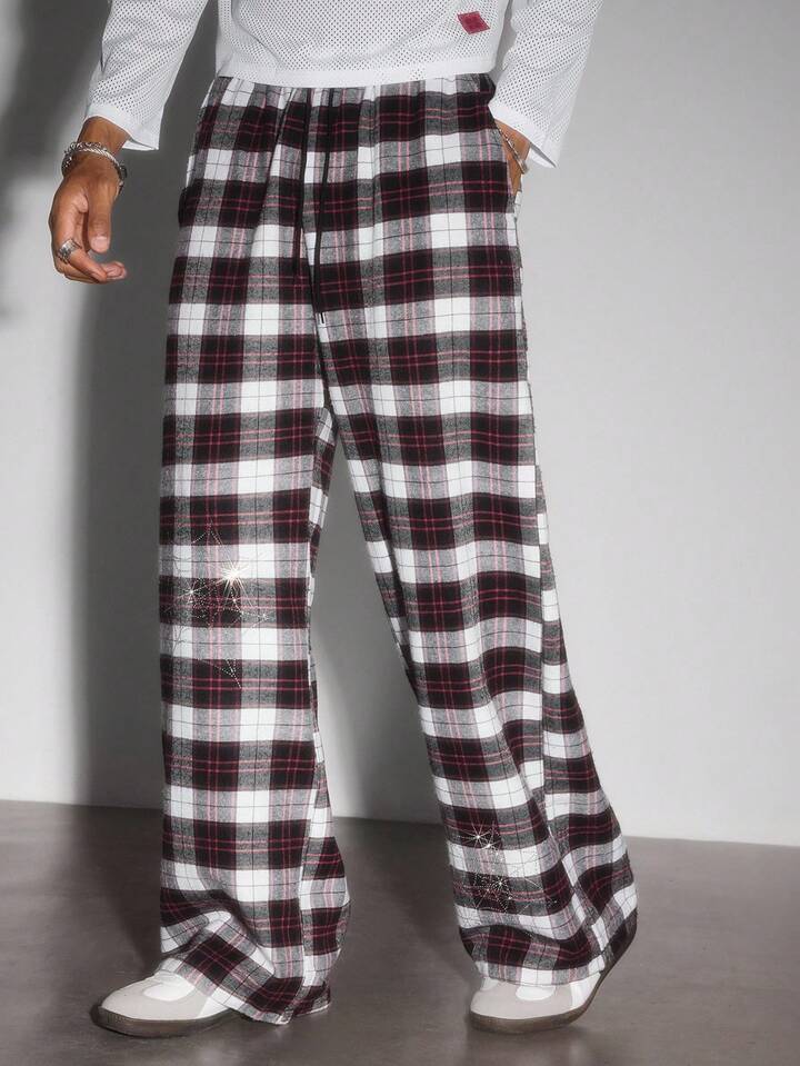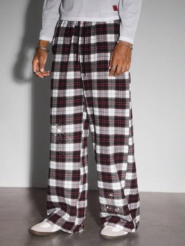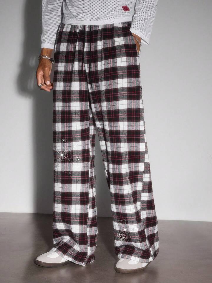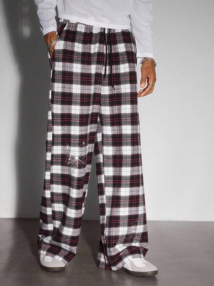 Street Life Men's Plaid Rhinestone Drawstring Waist Pocket Wide Leg Casual Pants