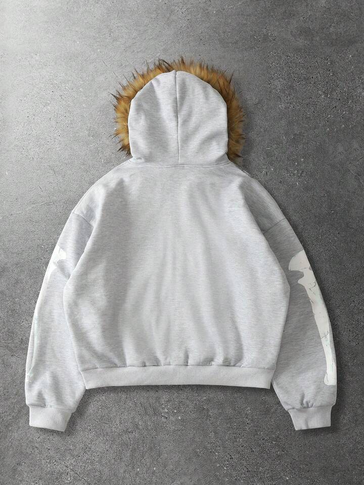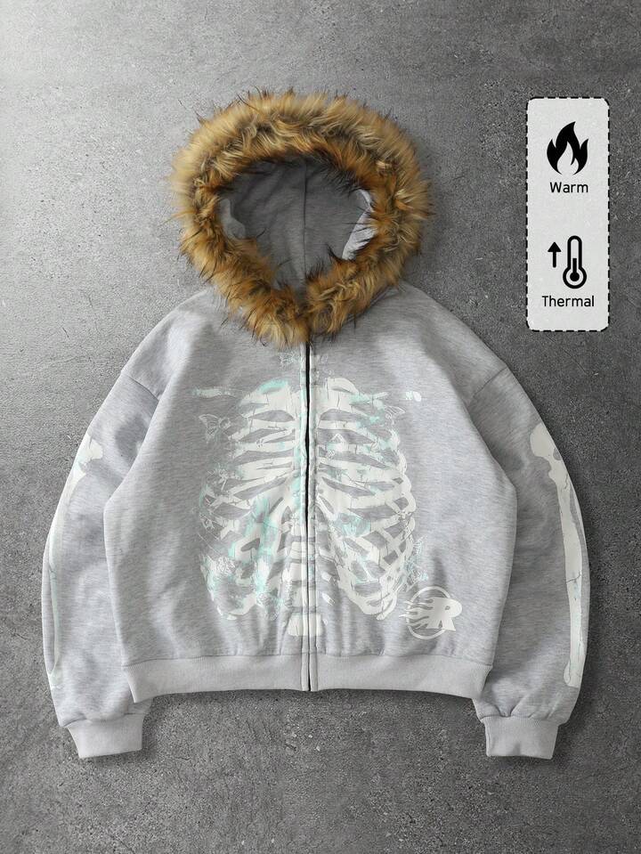 Street Life Men's Plush Collar Skeleton Print Fluffy Collar Sweatshirt