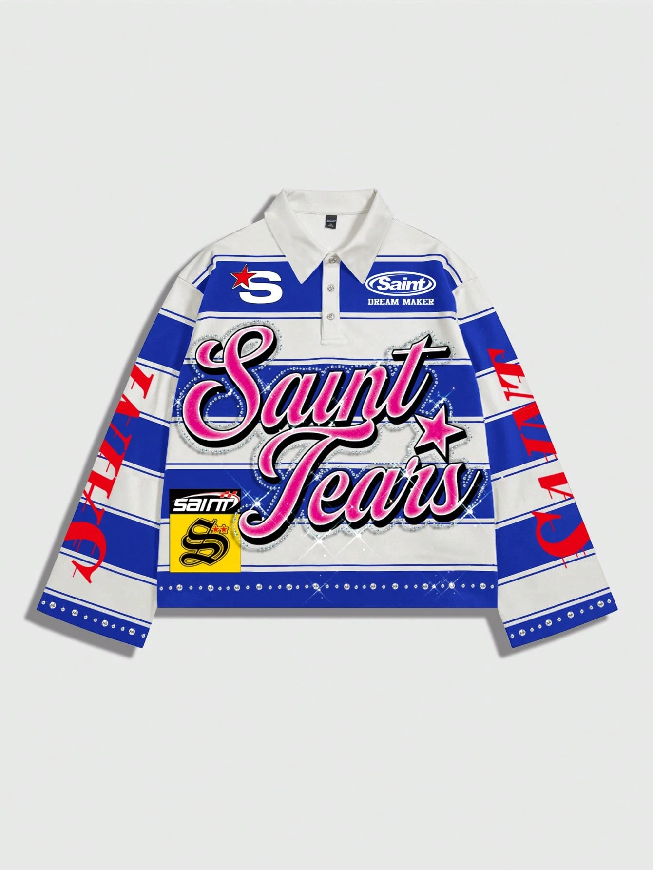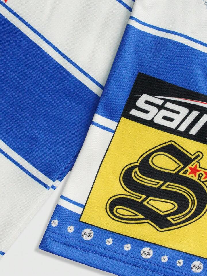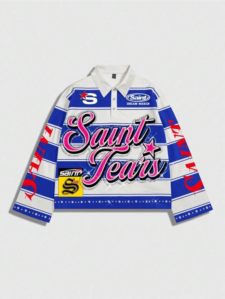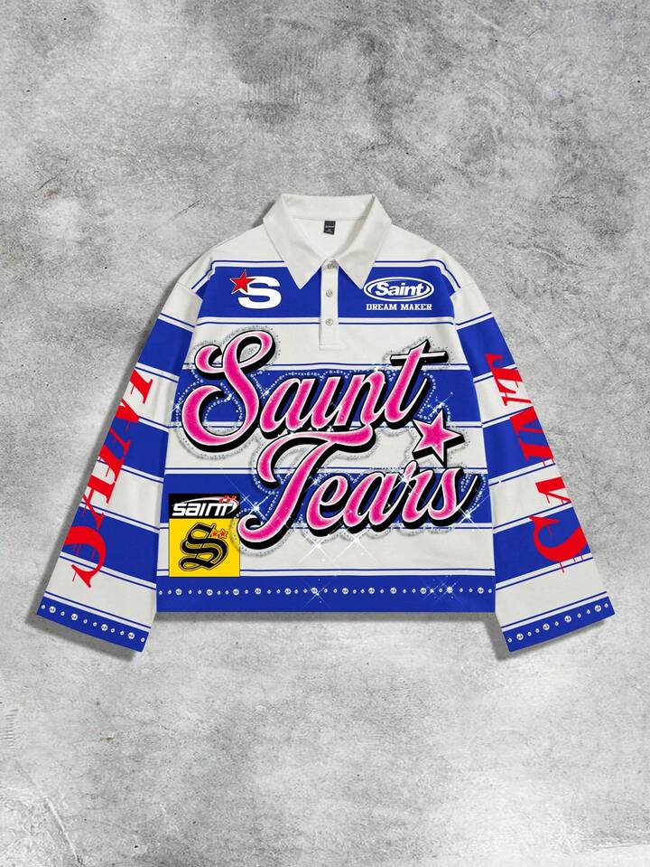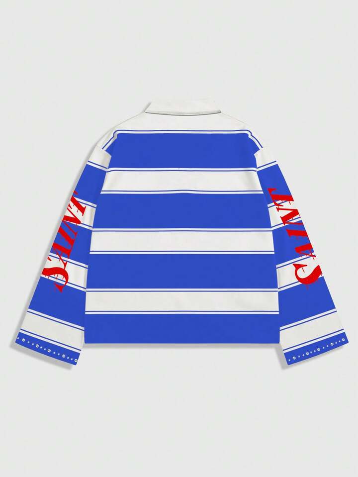 Street Life Men's Preppy Striped Collar Long Sleeve Printed T-Shirt, Casual College Style Top