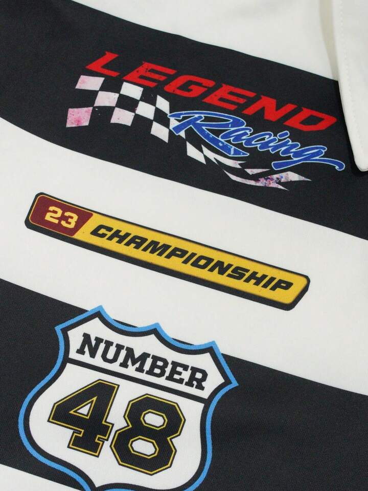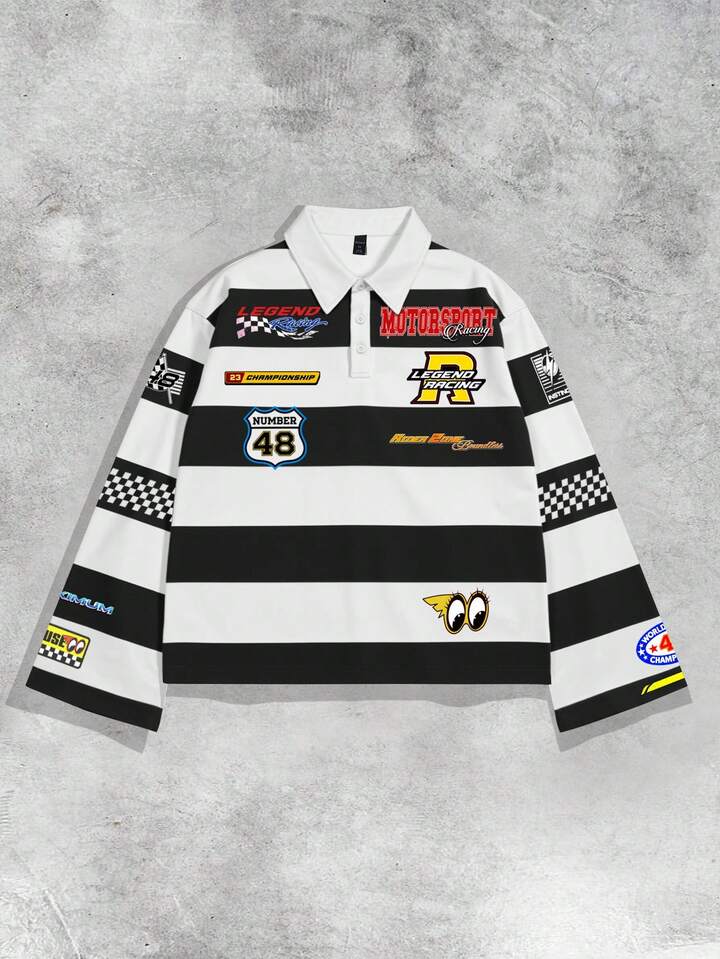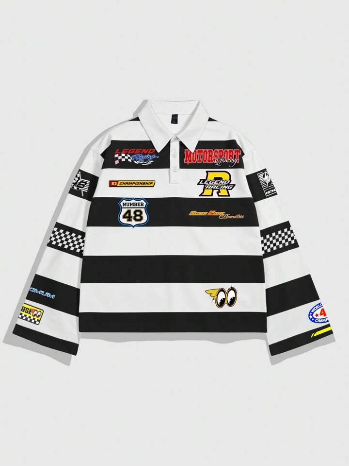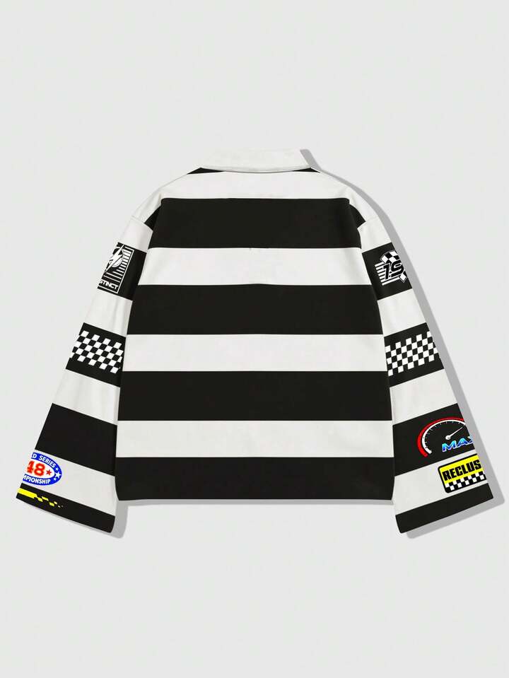Street Life Men's Printed Long Sleeve Striped Polo Collar T-Shirt, Casual College Style Top