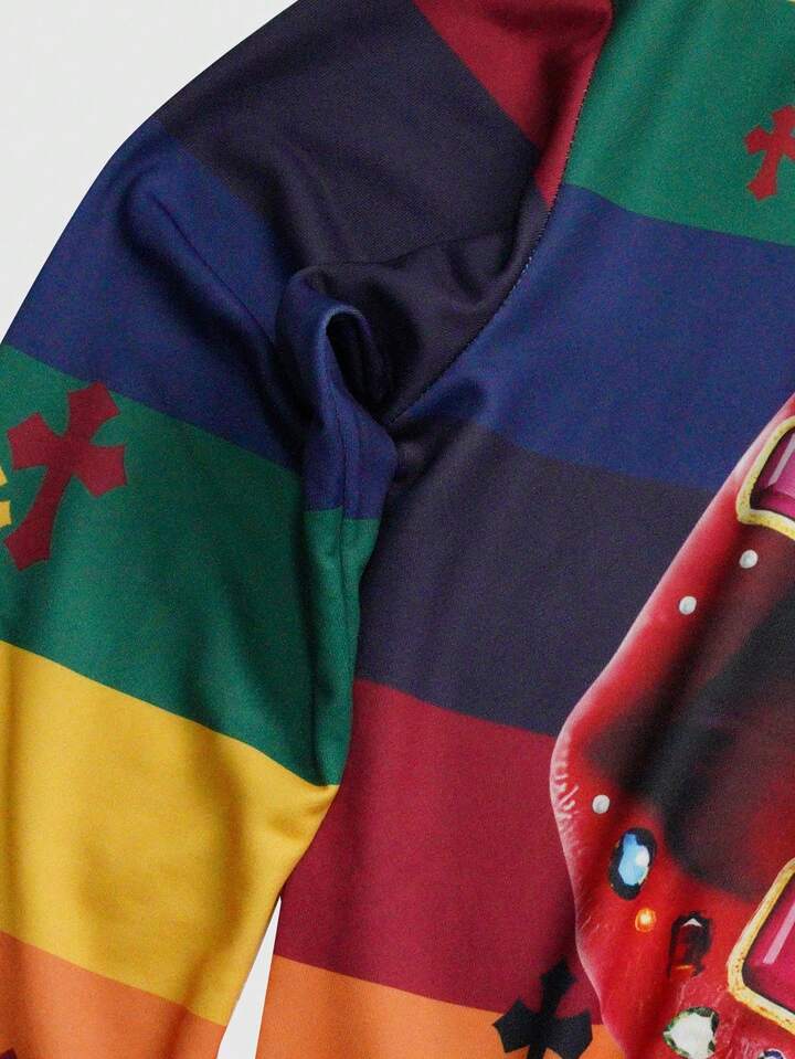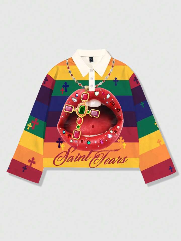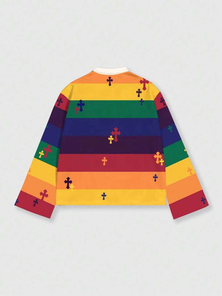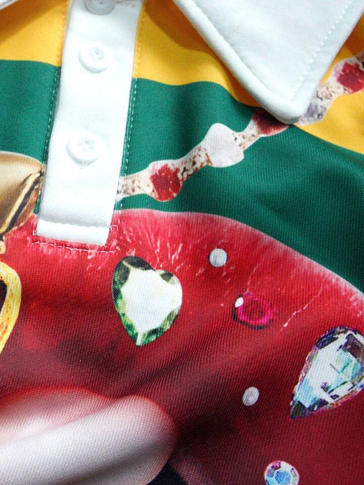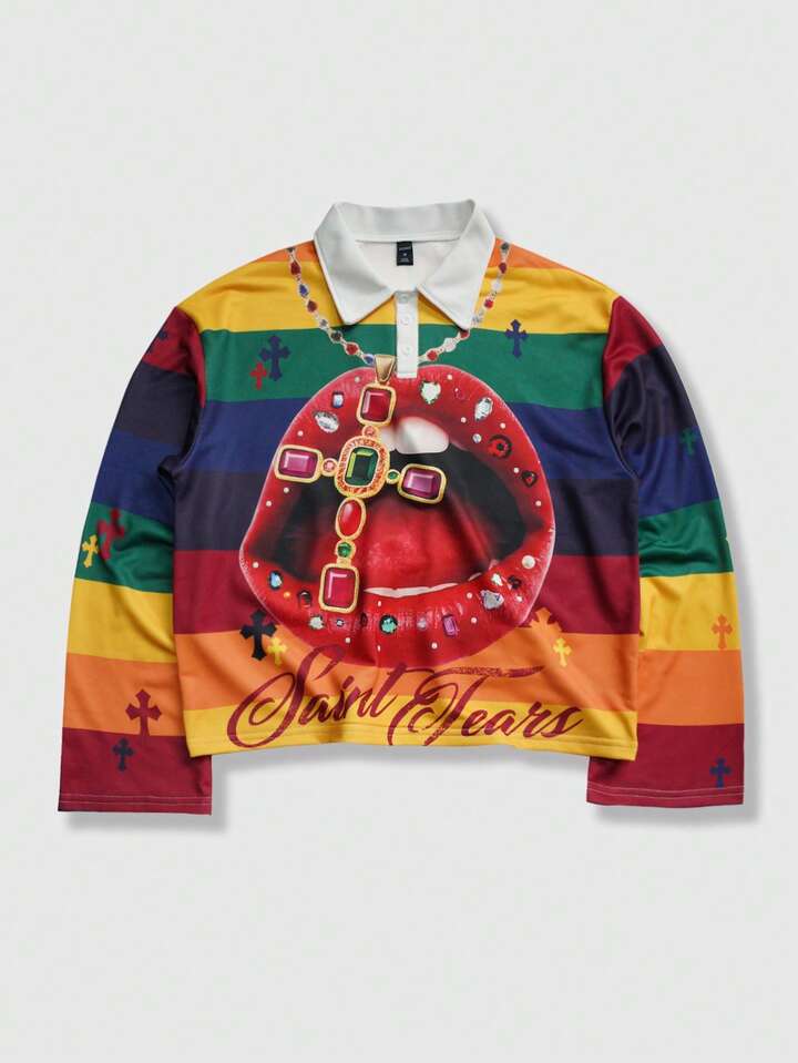 Street Life Men's Printed Long Sleeve Striped Polo Collar T-Shirt, Casual Collegiate Style Top