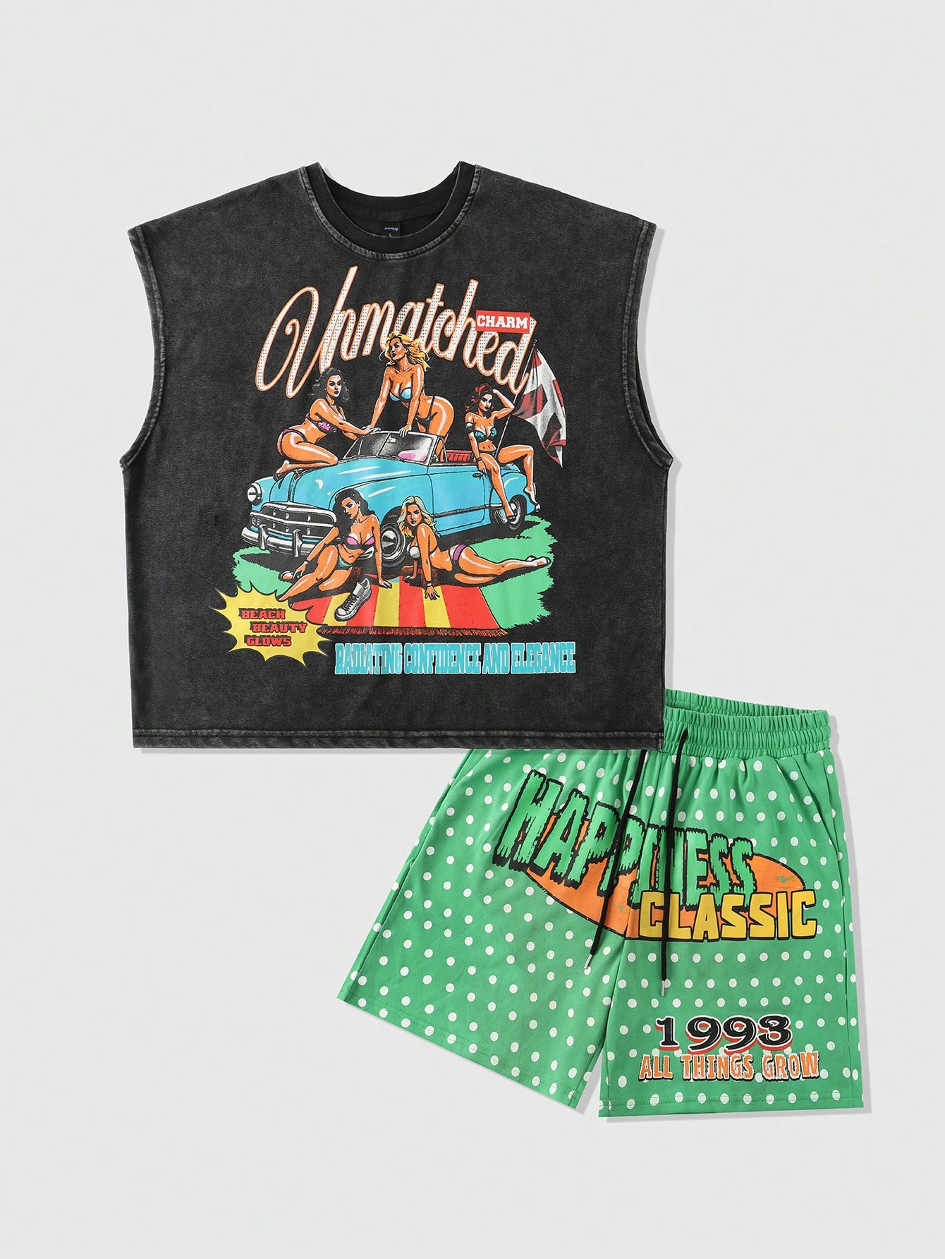 Street Life Men's Printed Vest Set, Minimalist Fashion, Suitable For Summer Vacation