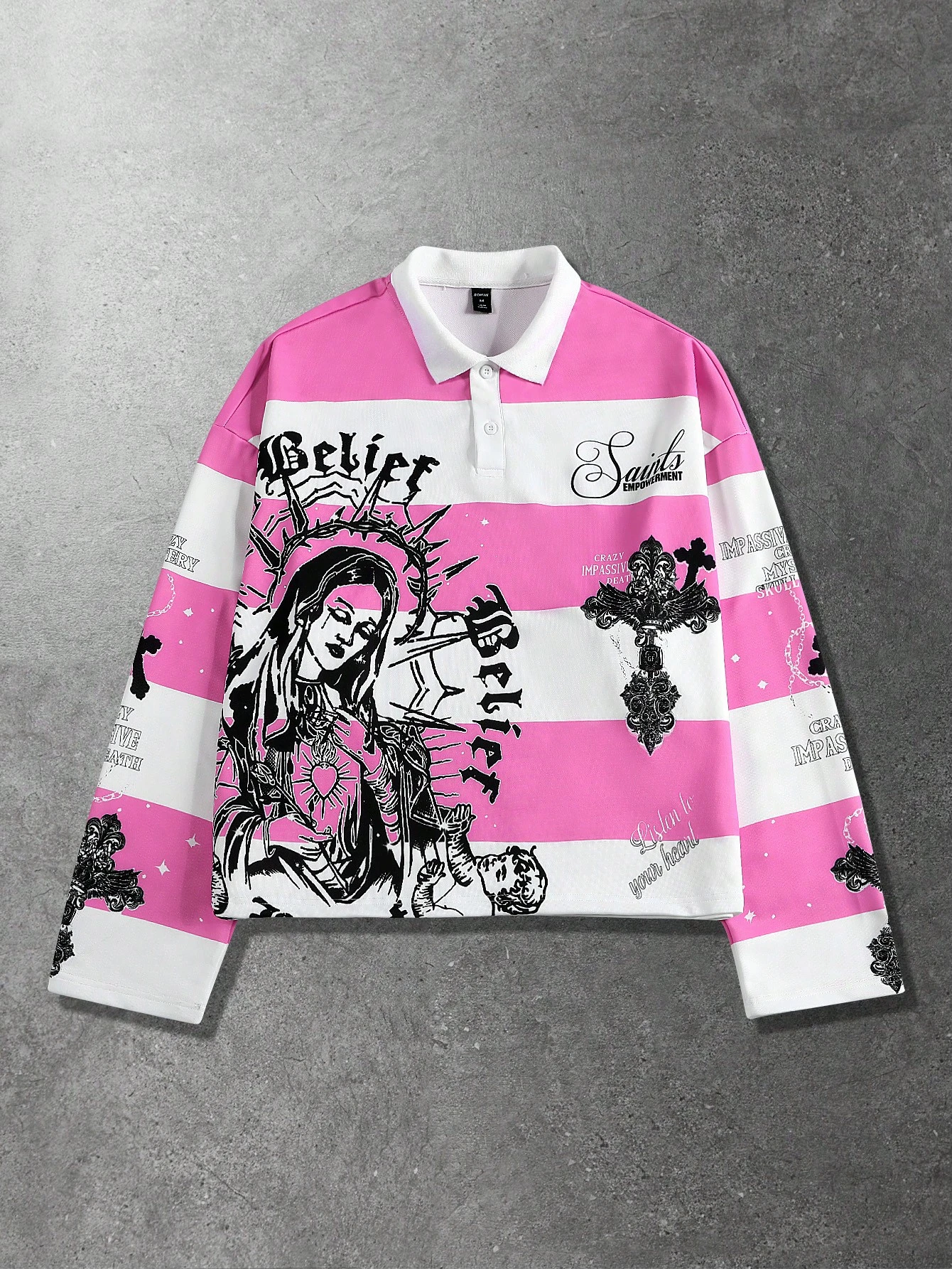 Street Life Men's Retro Virgin Mary Striped English Graphic Print Pullover Pullover Sweatshirt, Street American Style Polo Sweatshirt