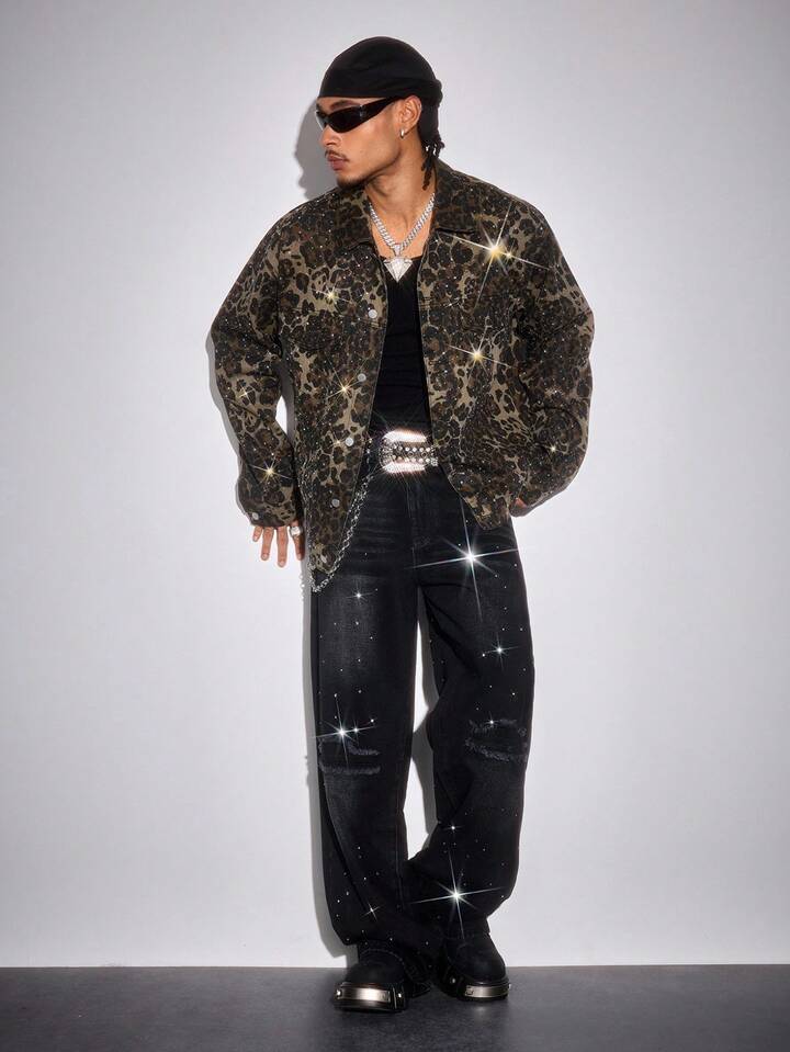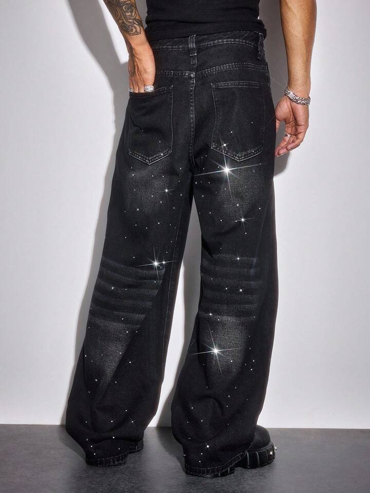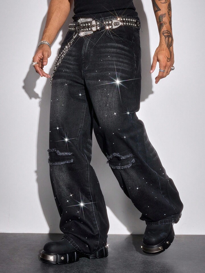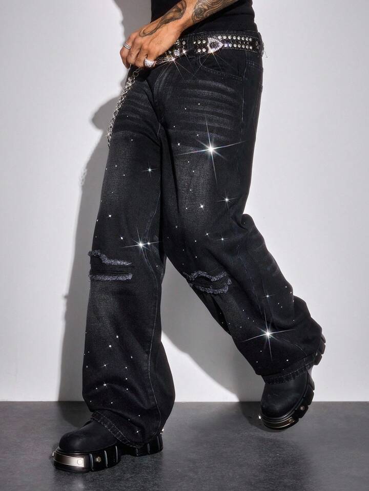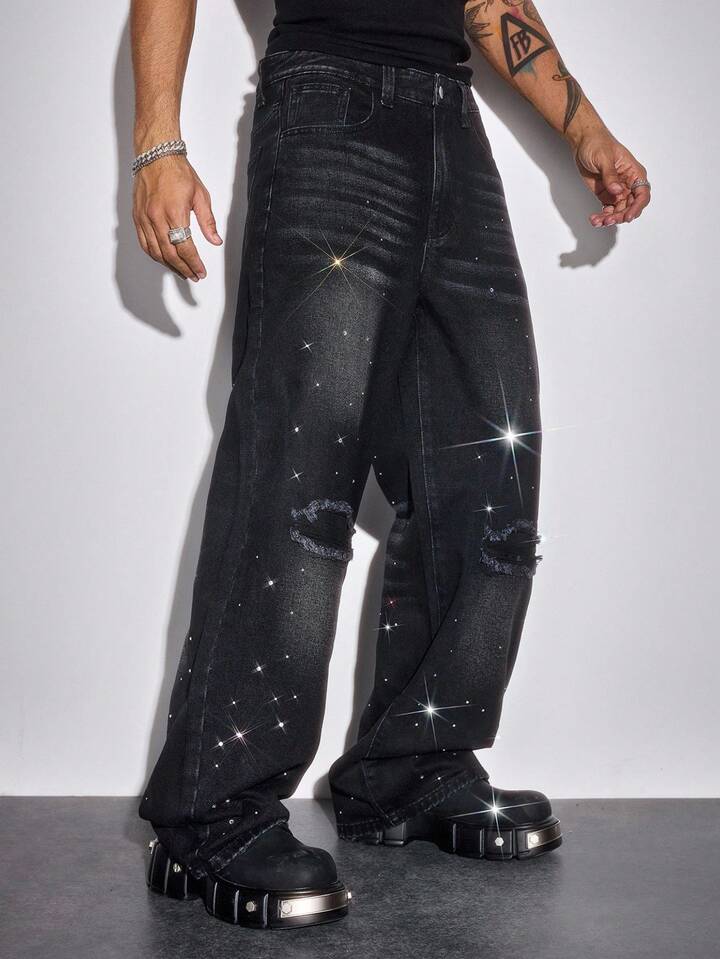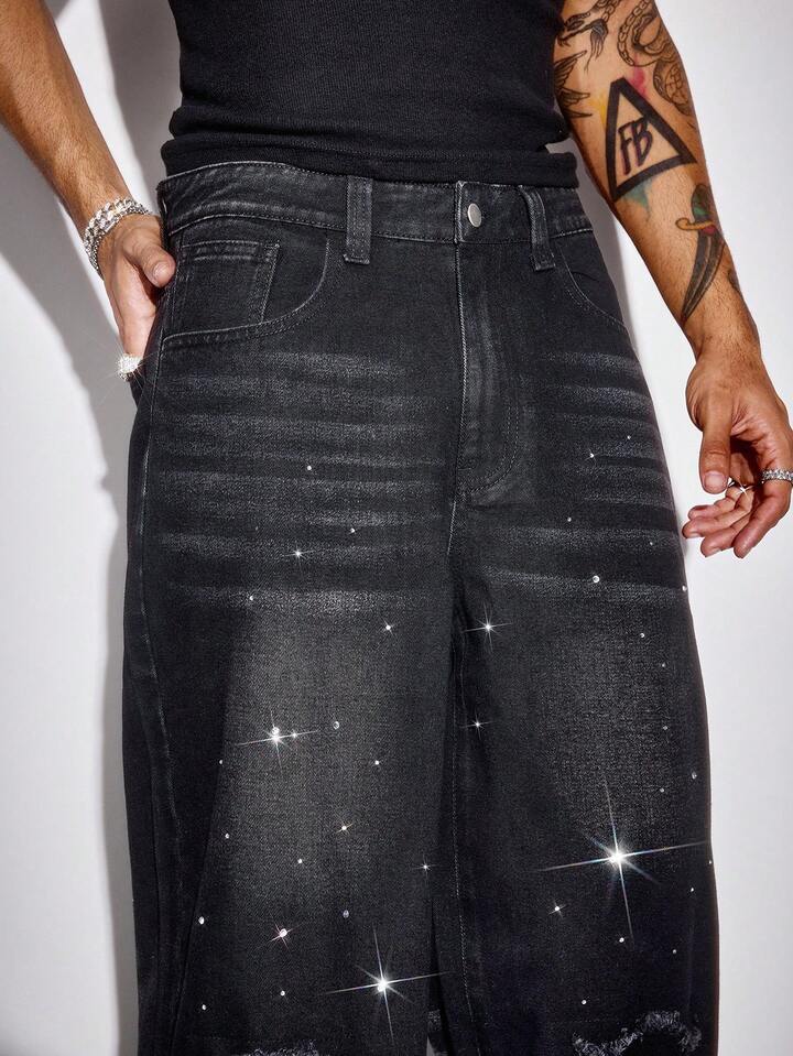 Street Life Men's Rhinestone Distressed Casual Loose Fit Washed Denim Jeans