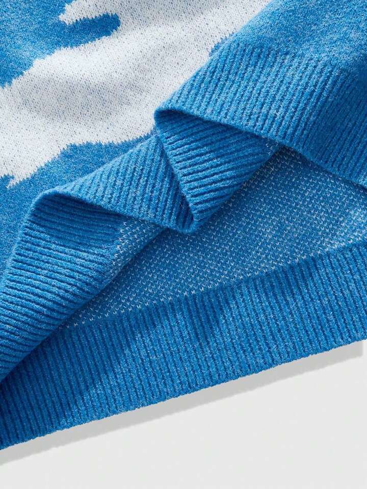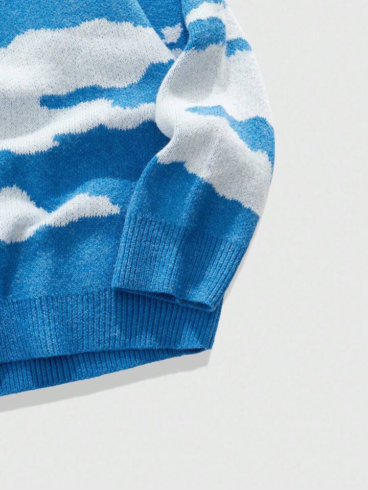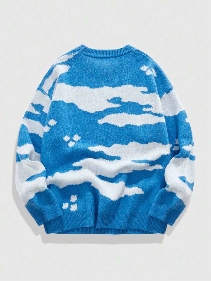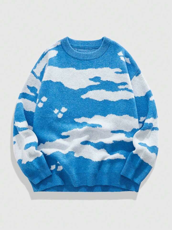 Street Life Men's Round Neck Blue Sky & White Cloud Knit Sweater, Street Fashion, Fall Winter