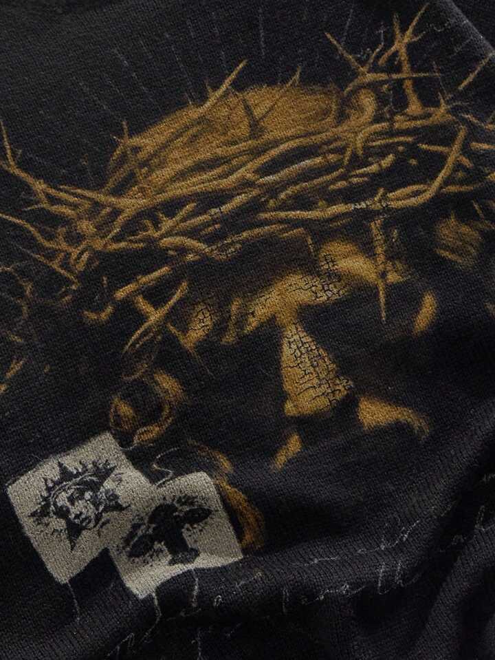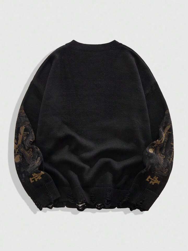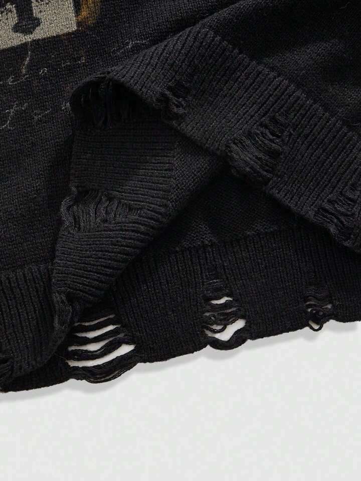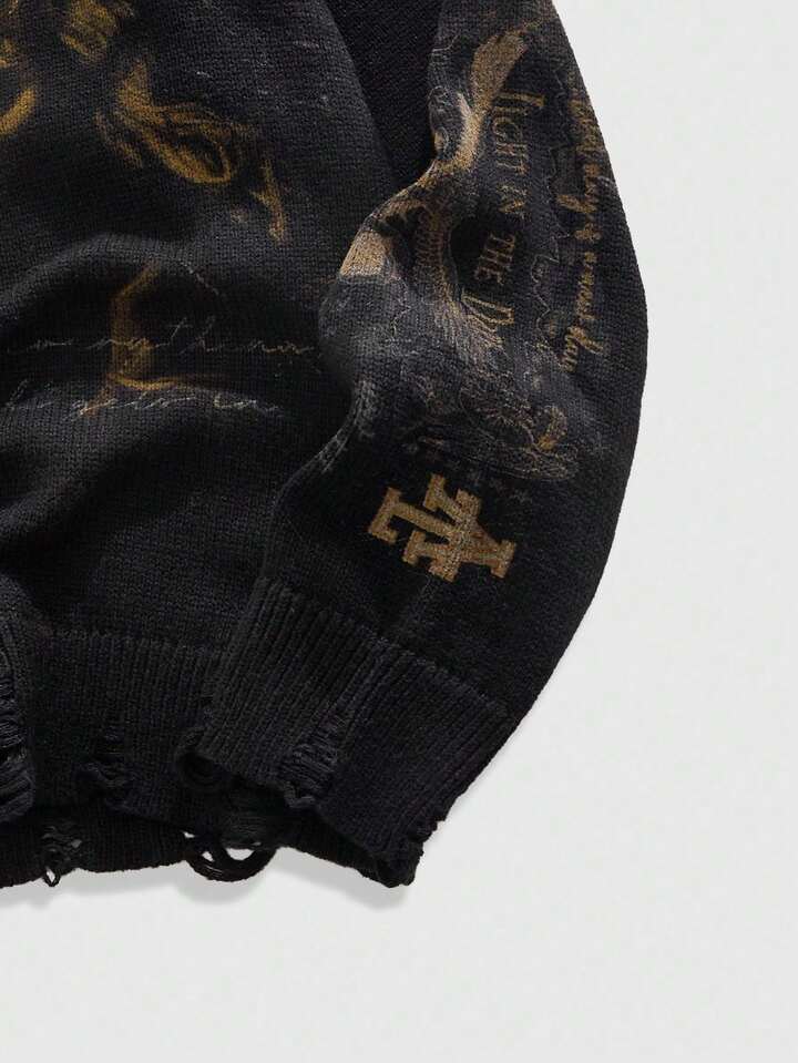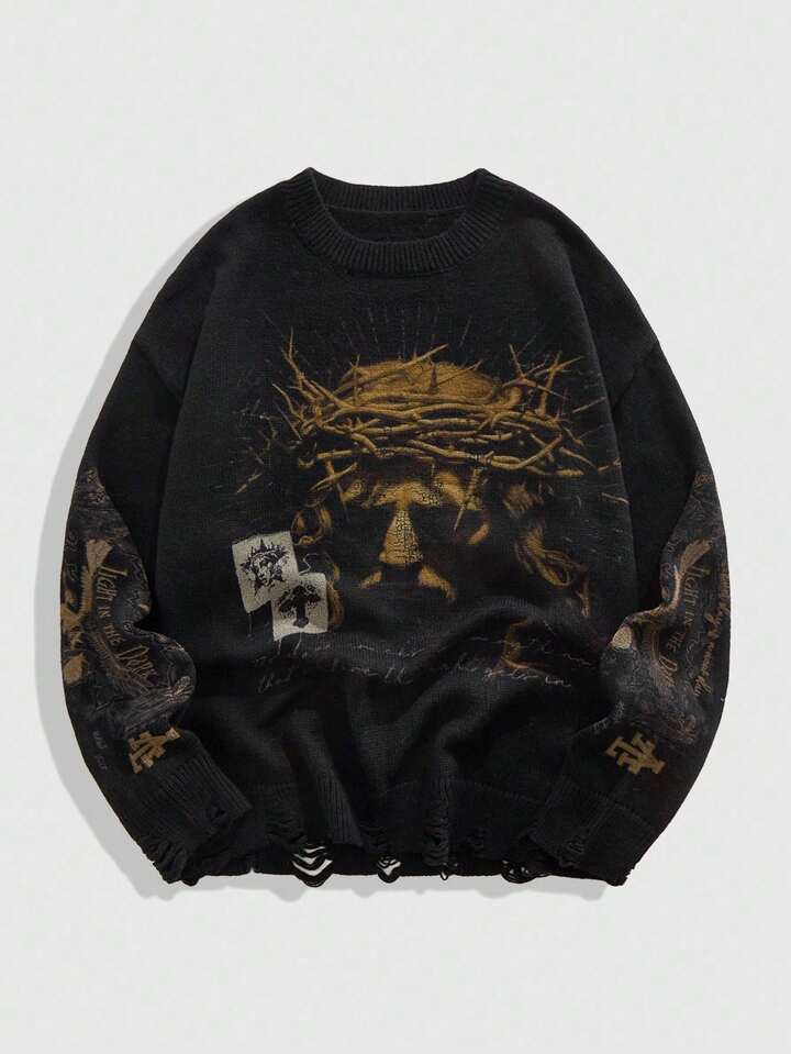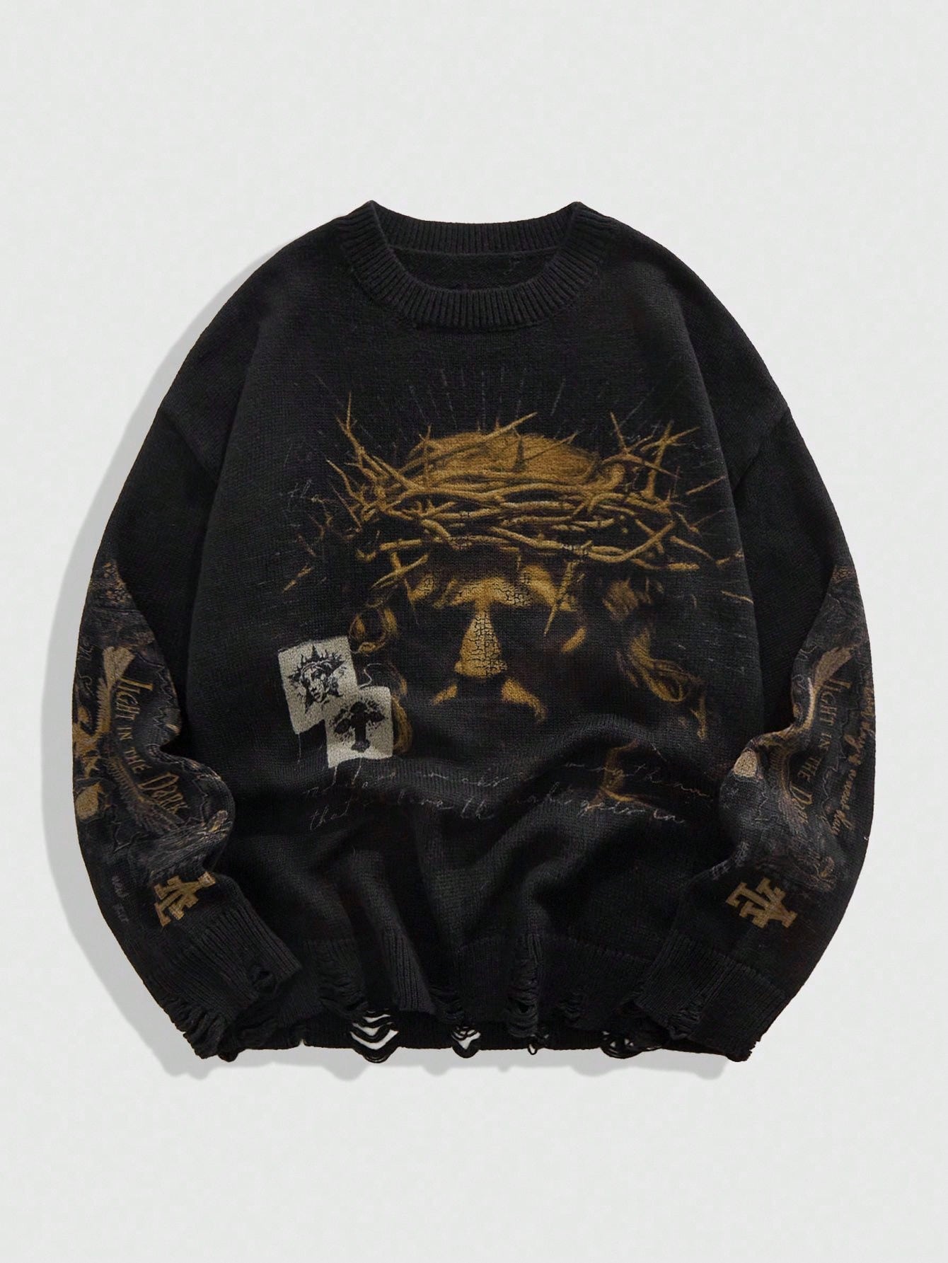 Street Life Men's Round Neck Jesus Print Knit Sweater, Stylish Streetwear, For Fall Winter, Grunge Style