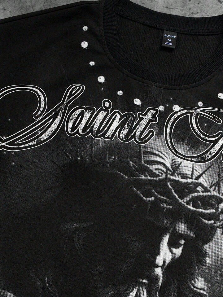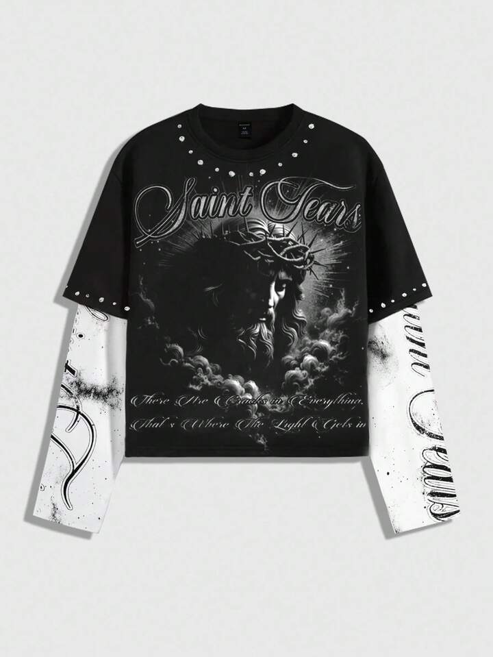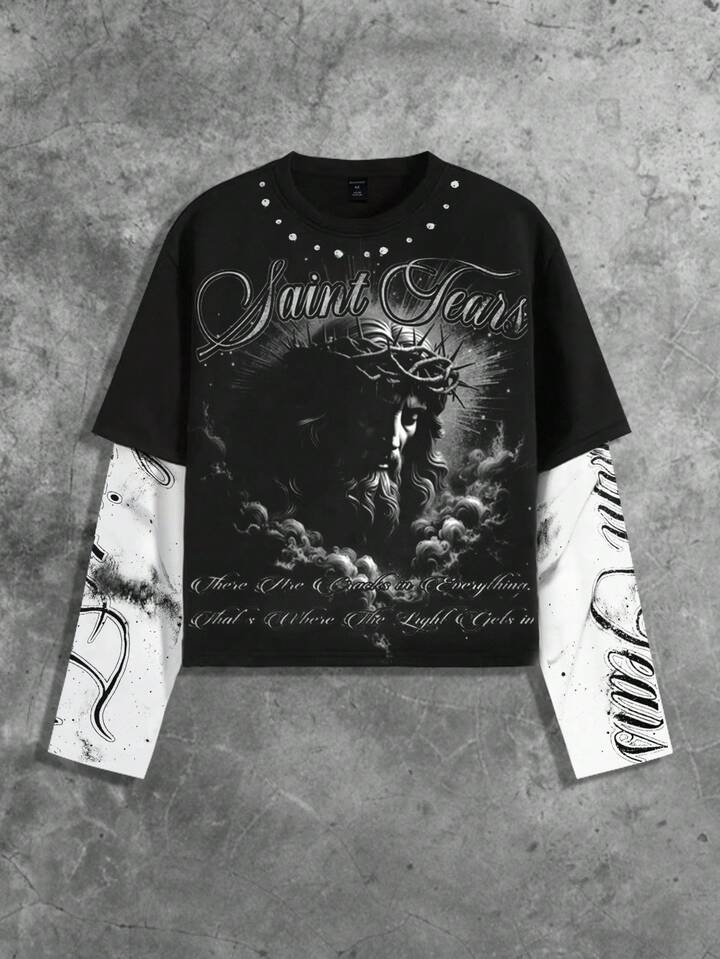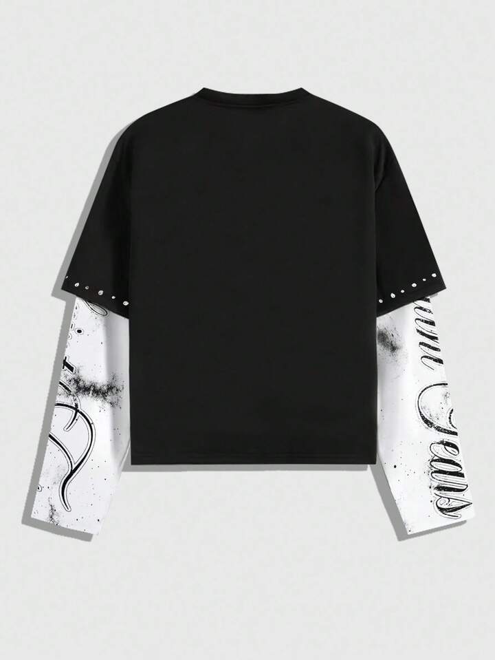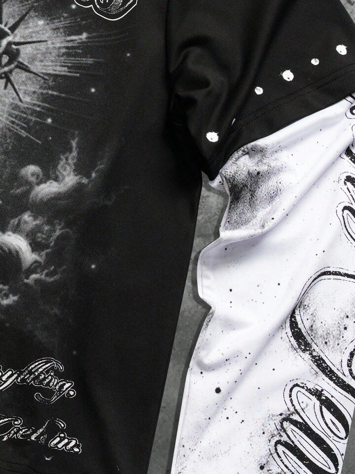 Street Life Men's Slogan & Figure Gothic Print Casual Long Sleeve 2 In 1 T-Shirt, For Fall