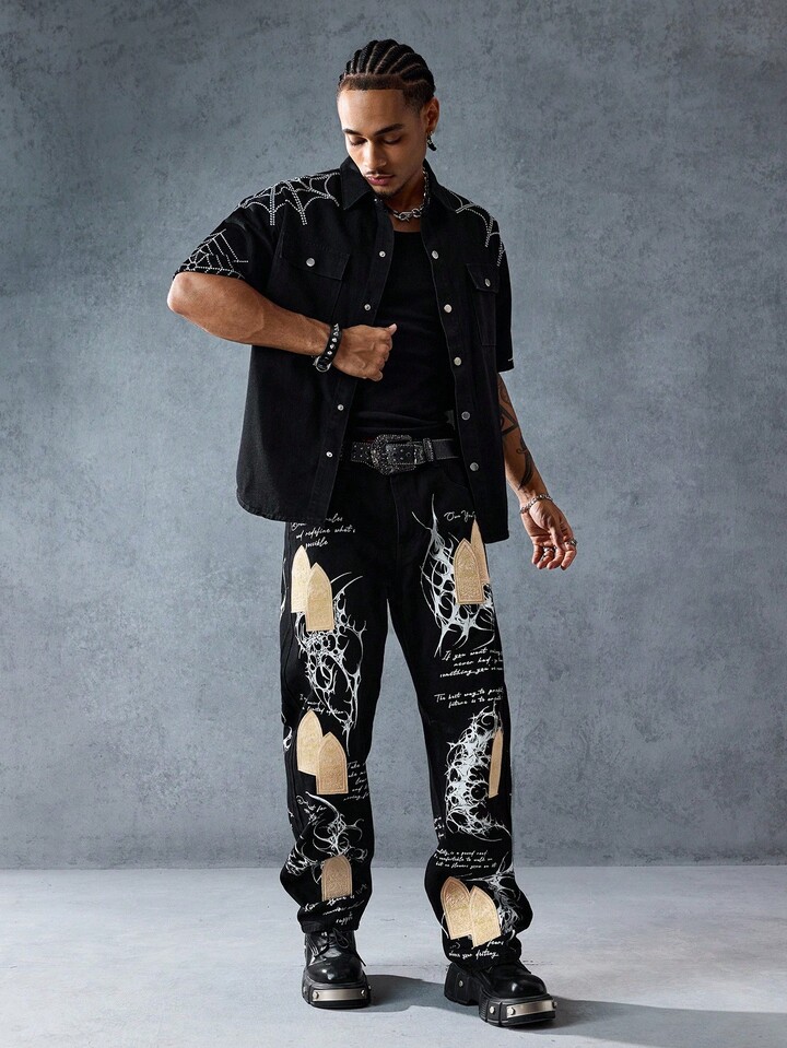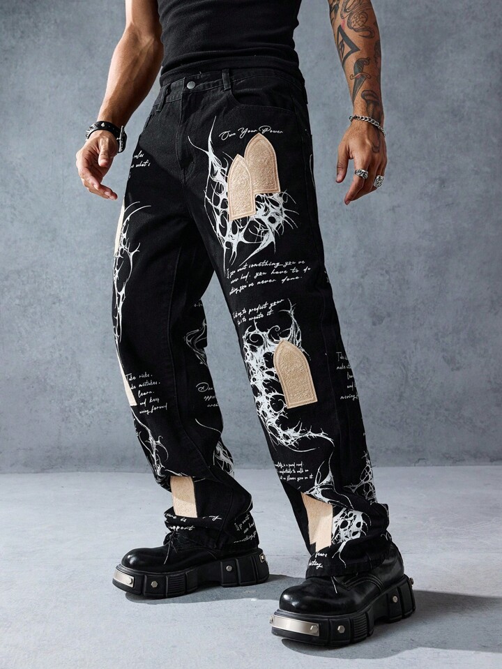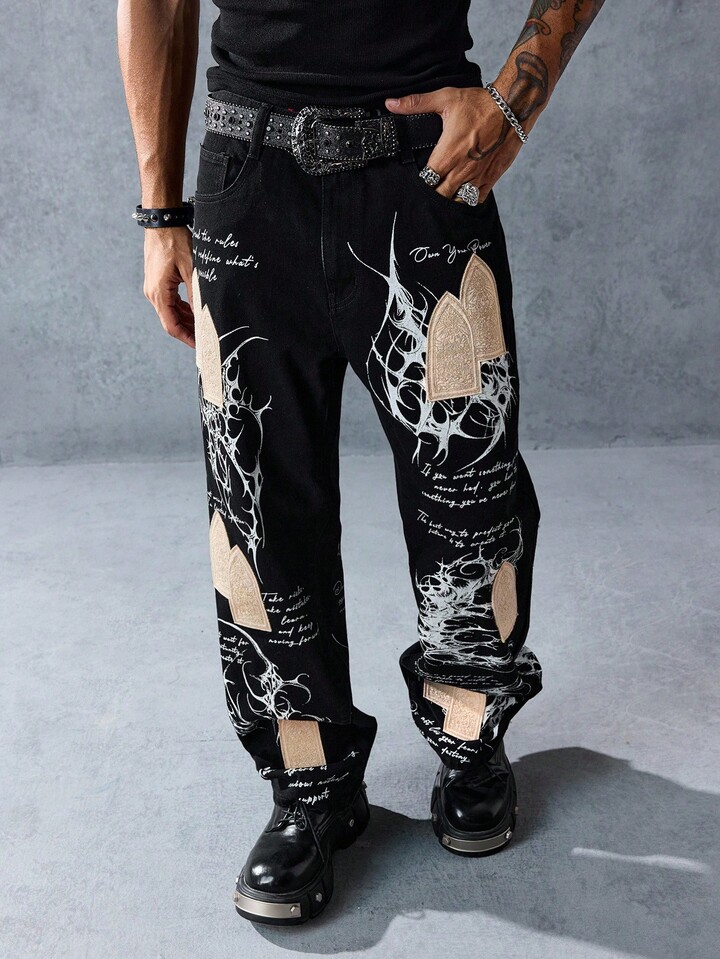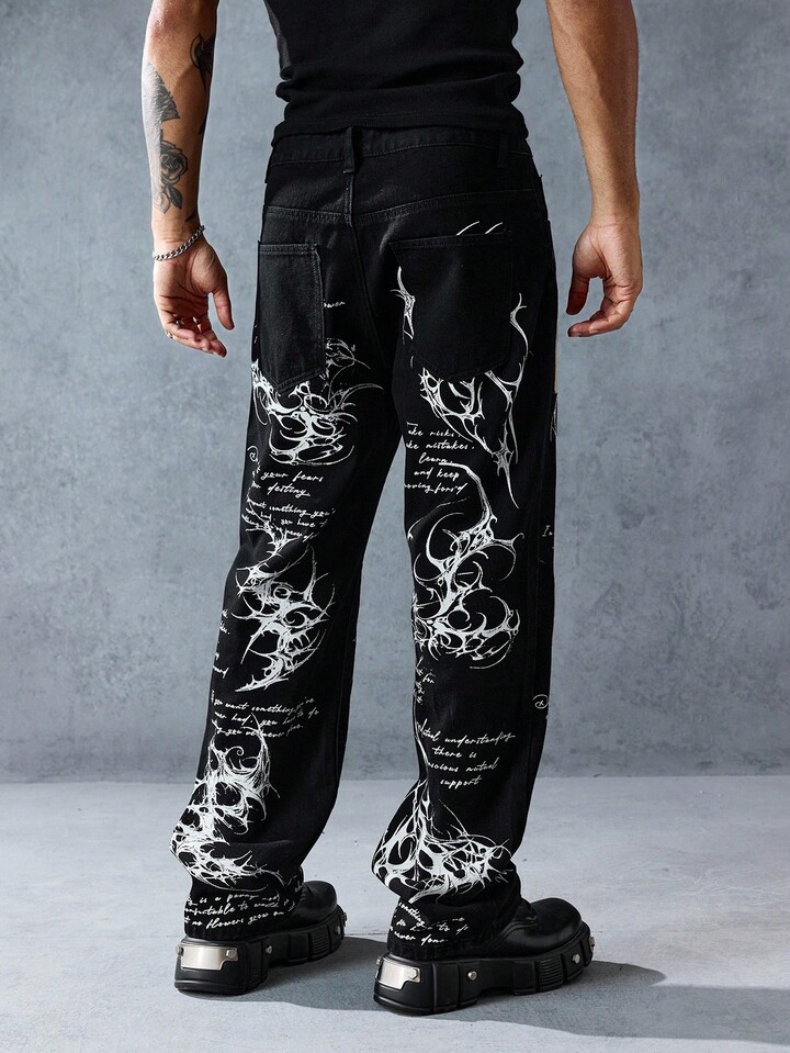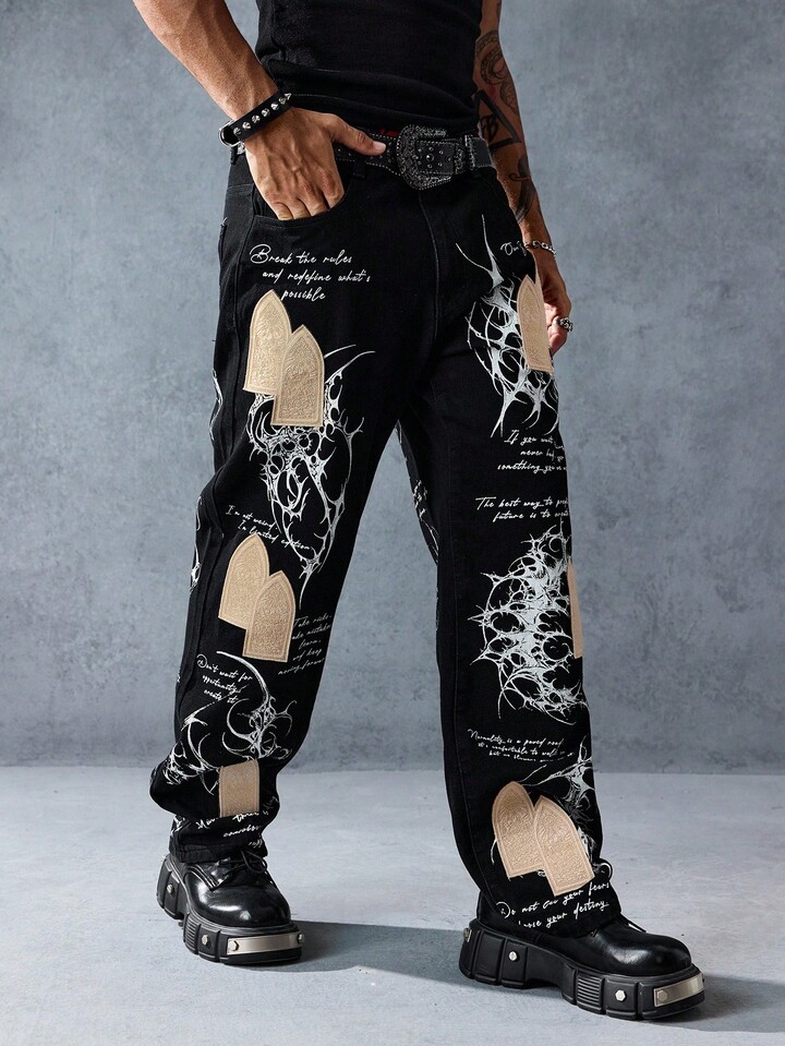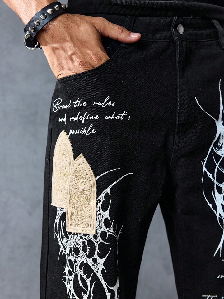 Street Life Men's Slogan Graphic Pocket Straight Loose Casual Jeans