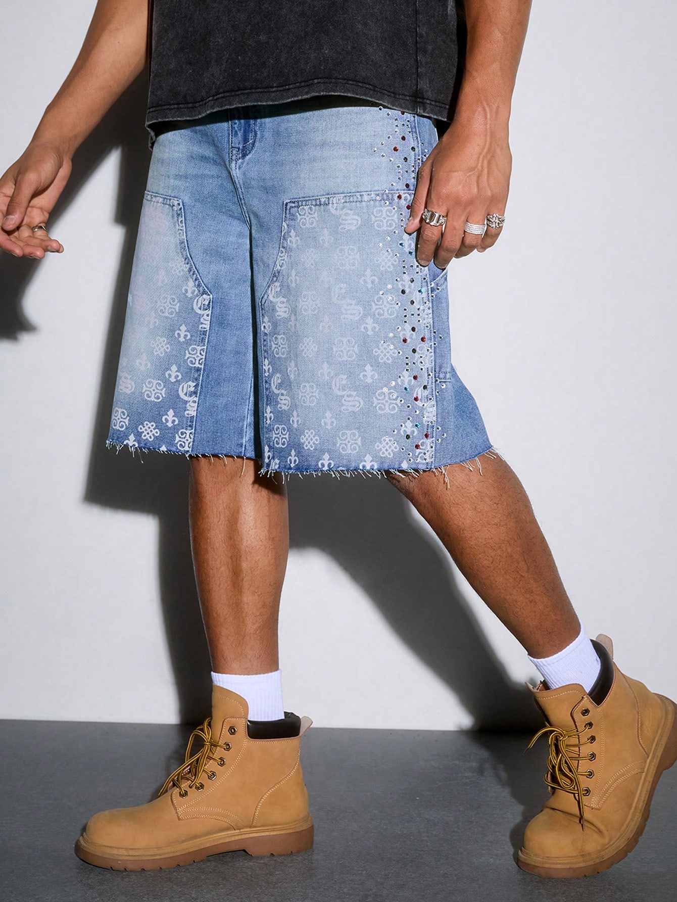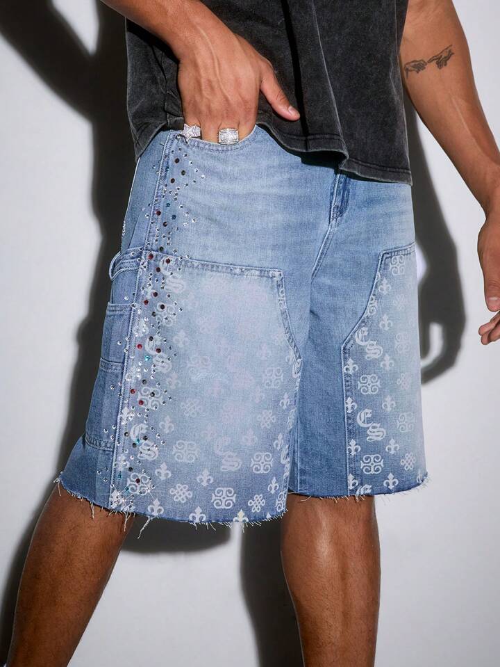 Street Life Men's Sparkle Diamond Floral Cross Print Frayed Hem Loose Denim Shorts