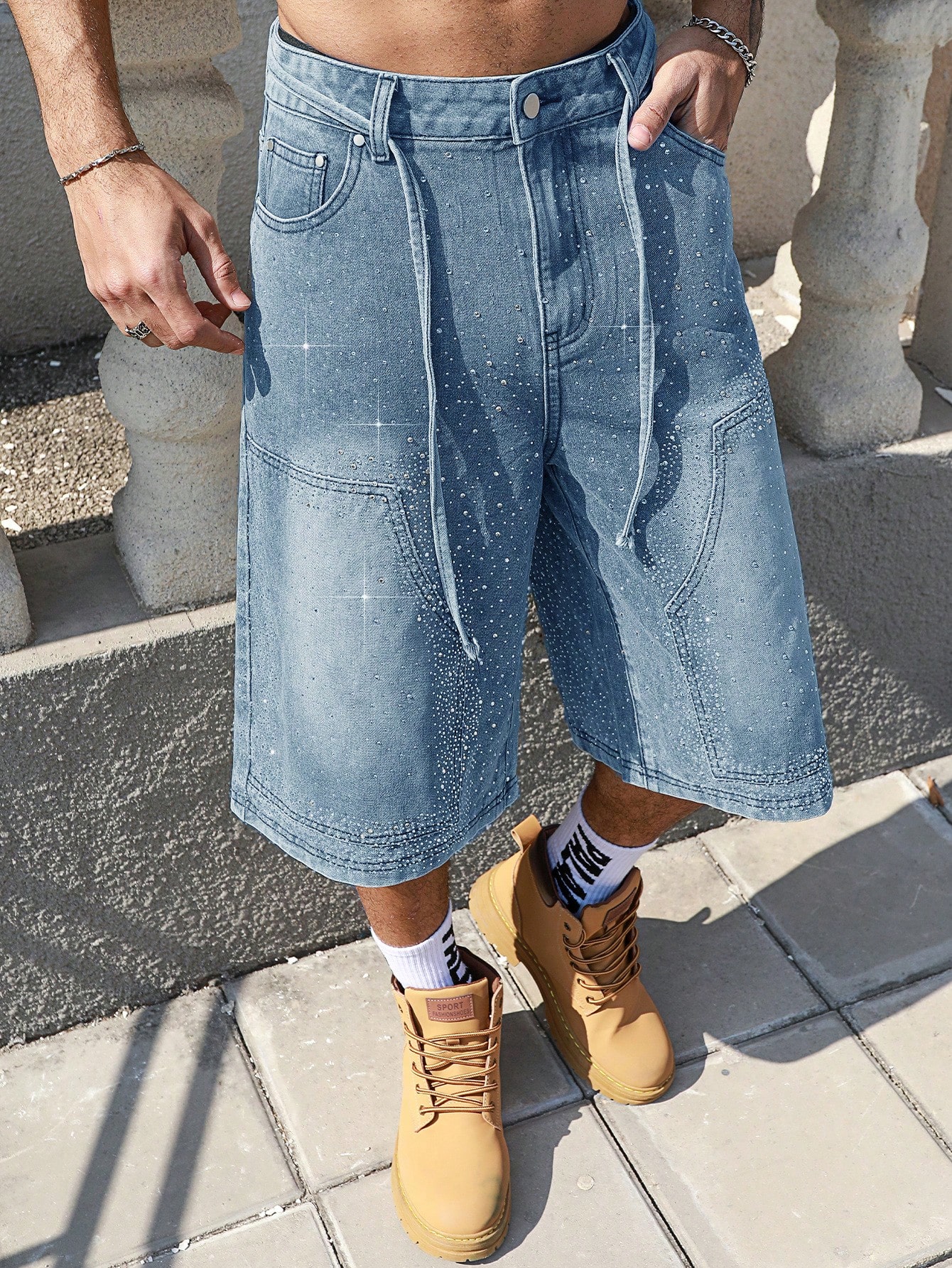 Street Life Men's Sparkling Diamond Decor Denim 3/4 Shorts Jorts