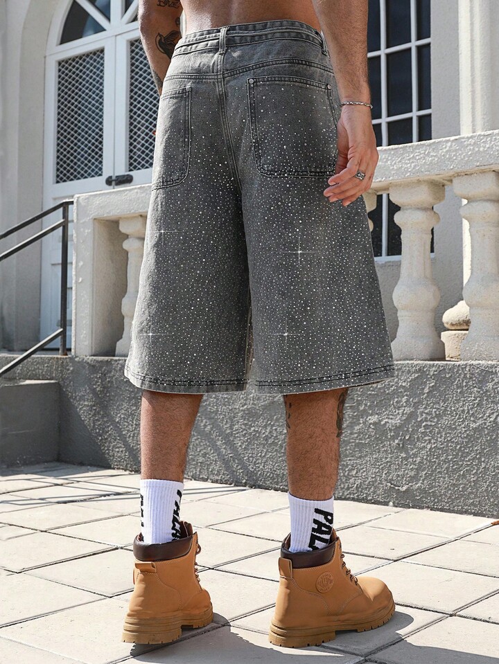 Street Life Men's Sparkling Rhinestone Embellished Denim Wide Leg 3/4 Pants