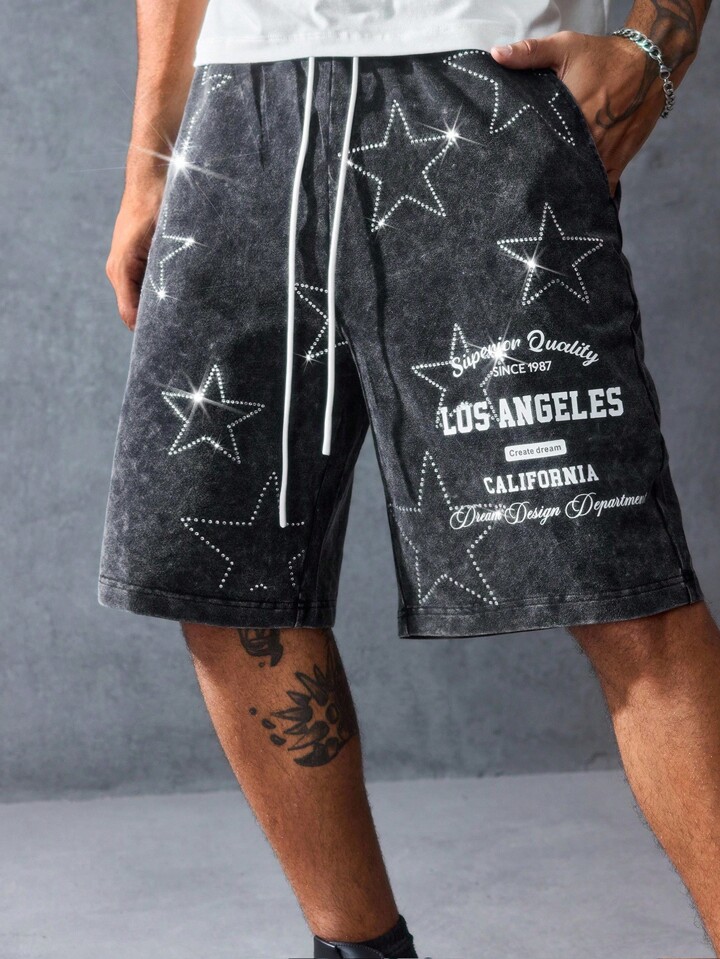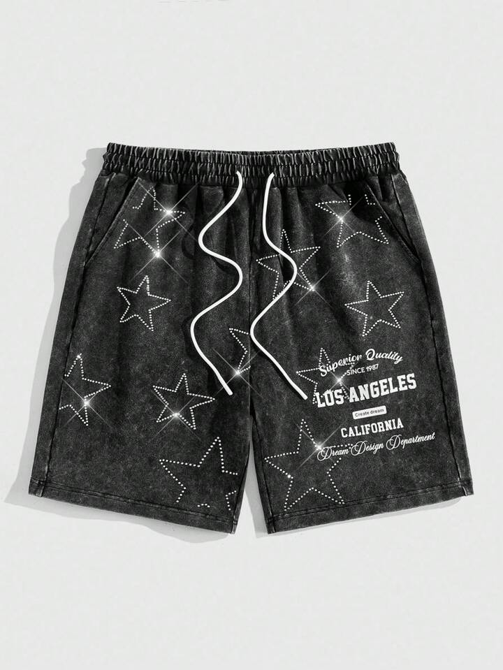 Street Life Men's Star Rhinestone Drawstring Waist Pocket Loose Washed Shorts