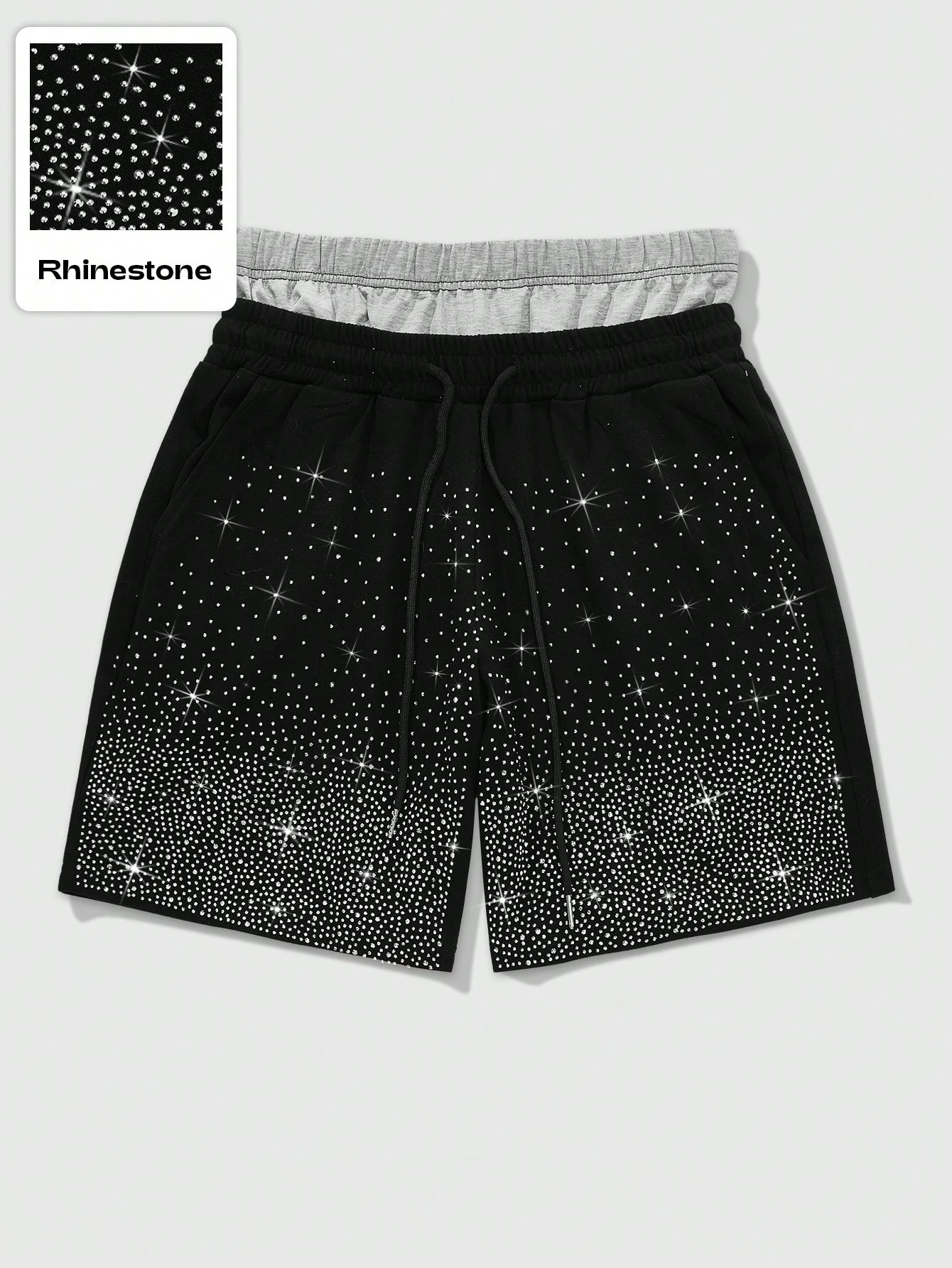 Street Life Men's Street Fashionable Brand Full-Covered Rhinestones Decor Drawstring Waist Casual Sports Shorts