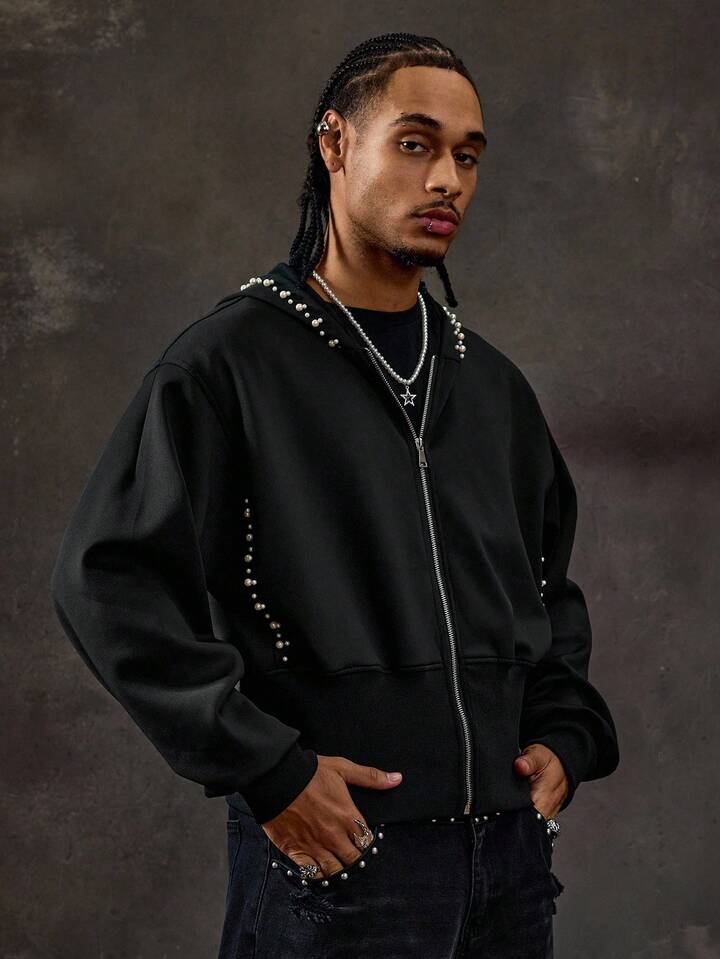 Street Life Men's Streetwear Casual Zip-Up Beaded Embroidery Hoodie, Fall