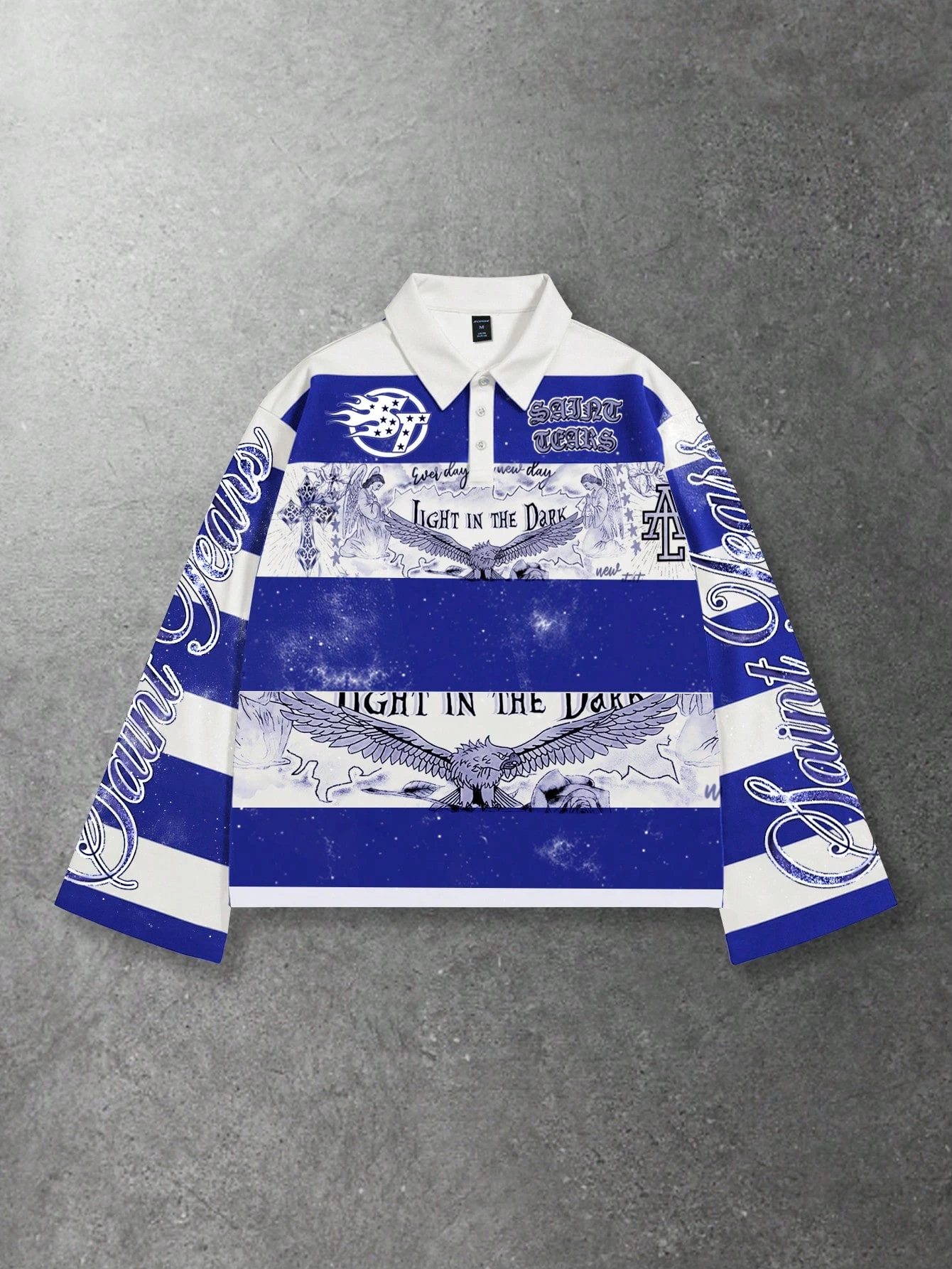 Street Life Men's Striped Collar Long Sleeve Printed T-Shirt, Casual College Style Top