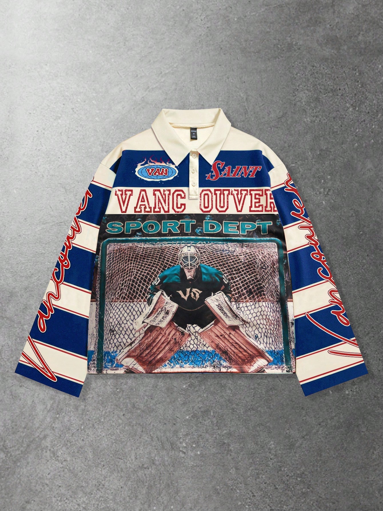 Street Life Men's Striped Print Long Sleeve Polo Collar T-Shirt, Casual College Style Top
