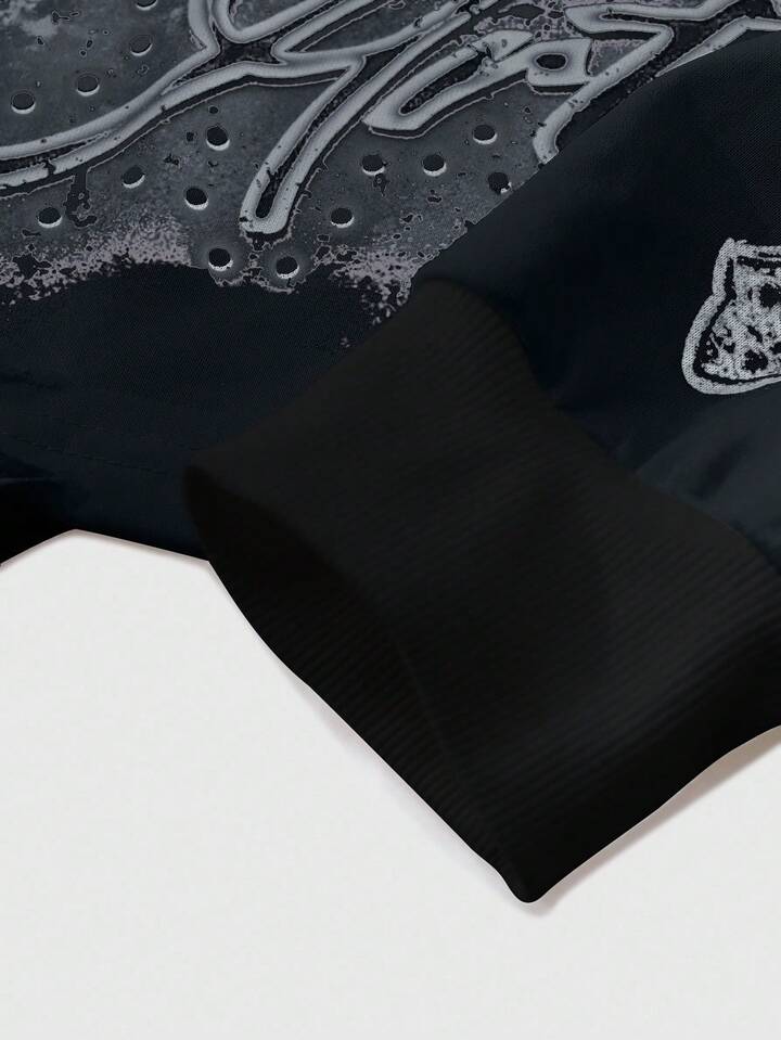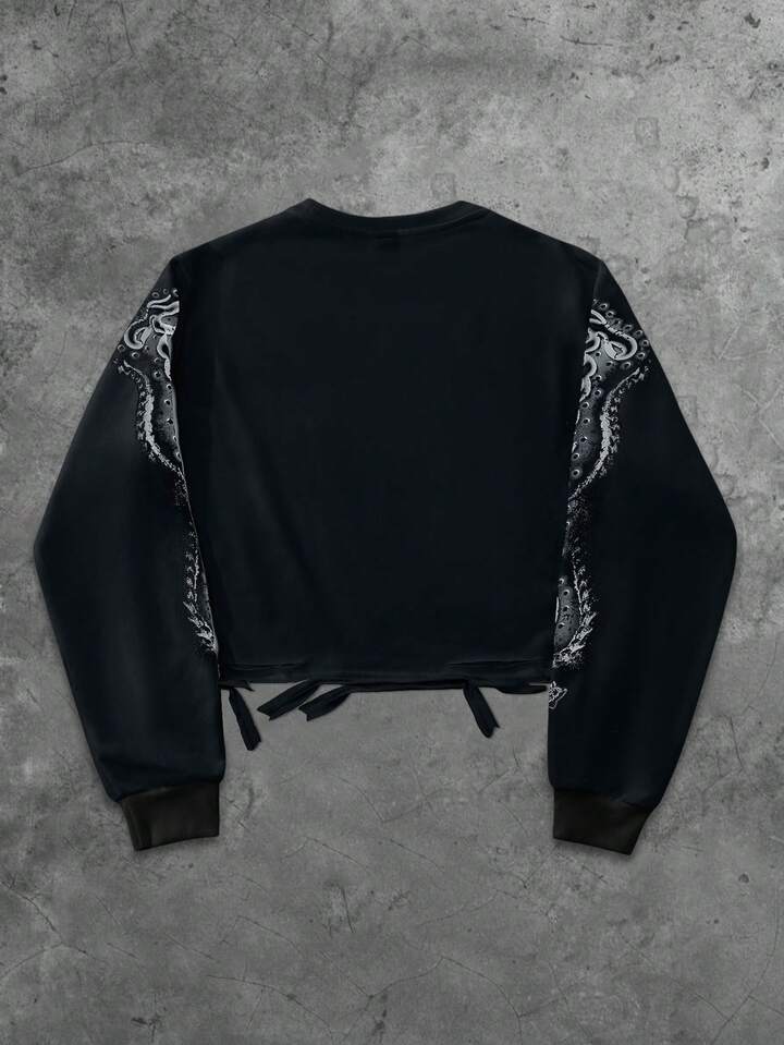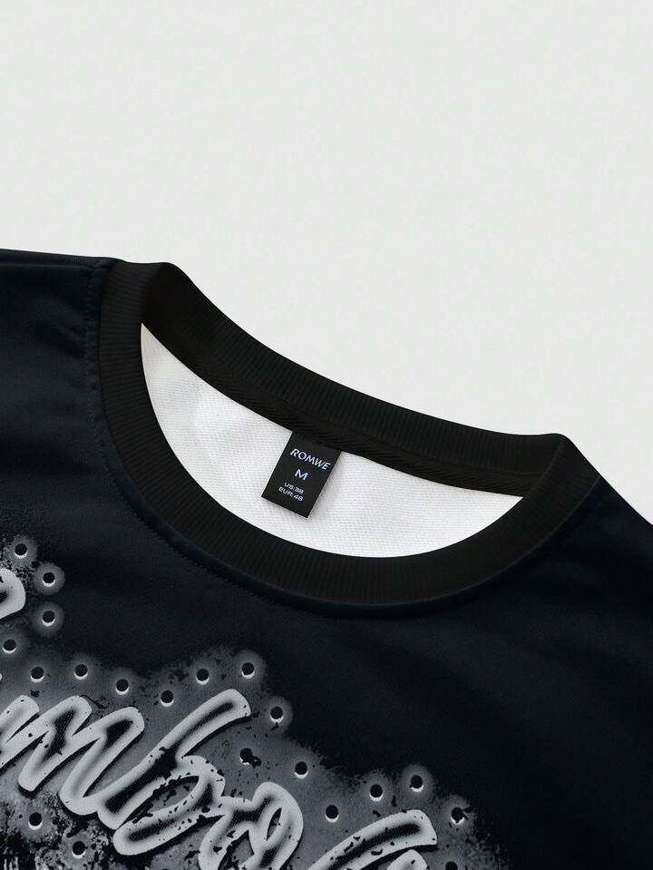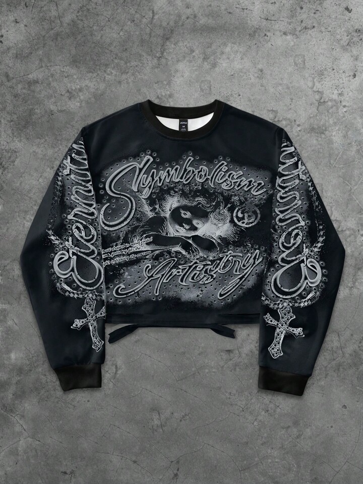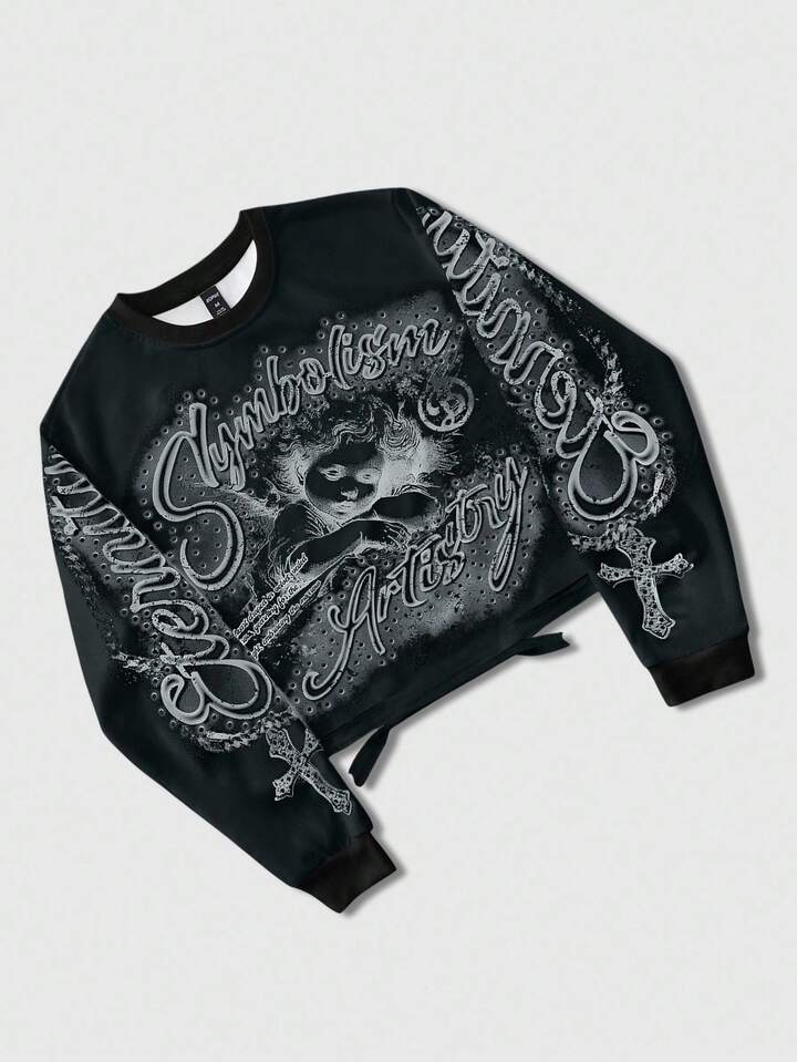Street Life Men's Vintage Cross & Angel Print Distressed Short Pullover Sweatshirt, Suitable For Autumn/Winter, Long Sleeve Top