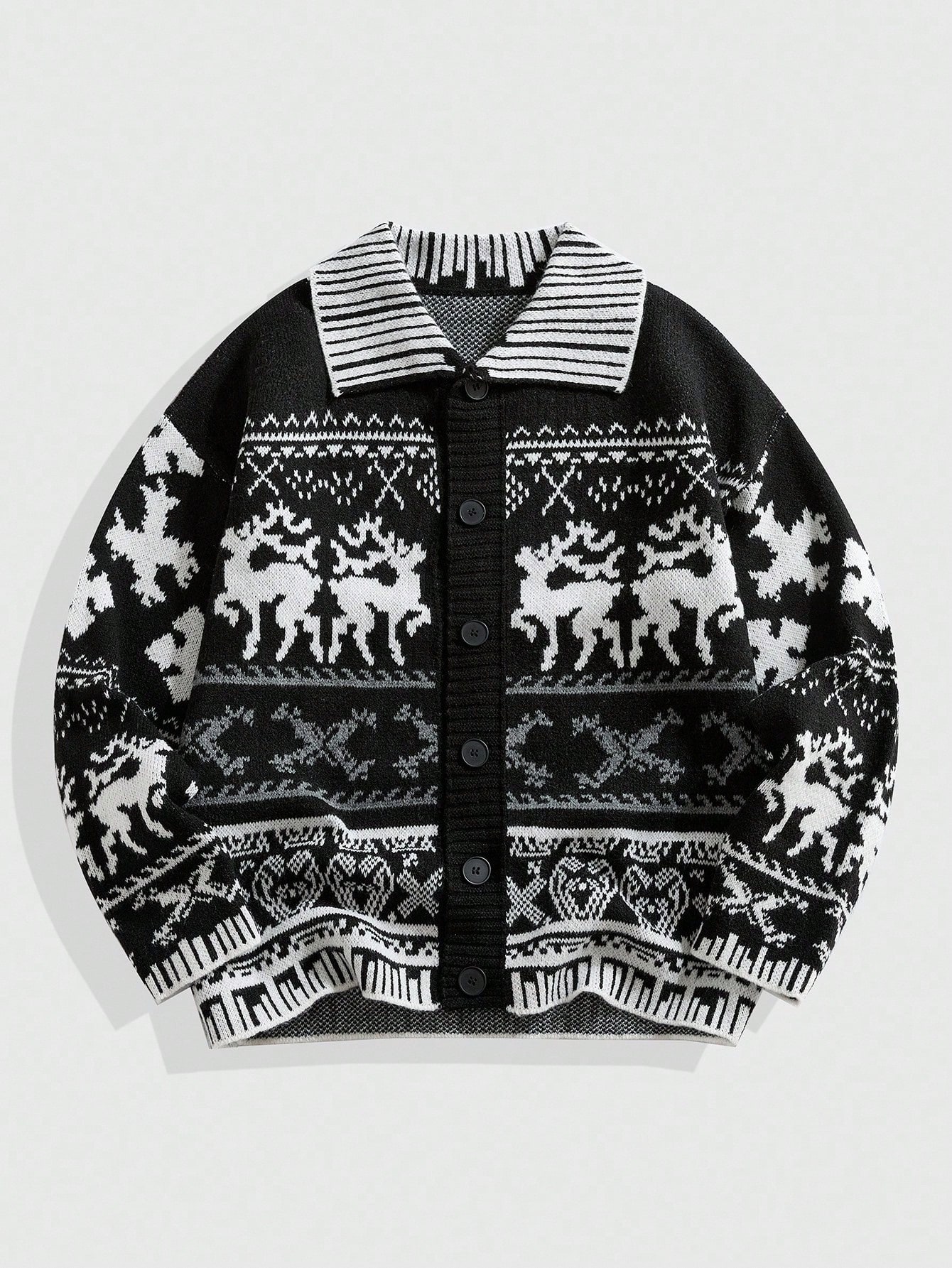 Street Life Men's Vintage Street Style Turndown Collar Fair Isle Cardigan, Fall/Winter