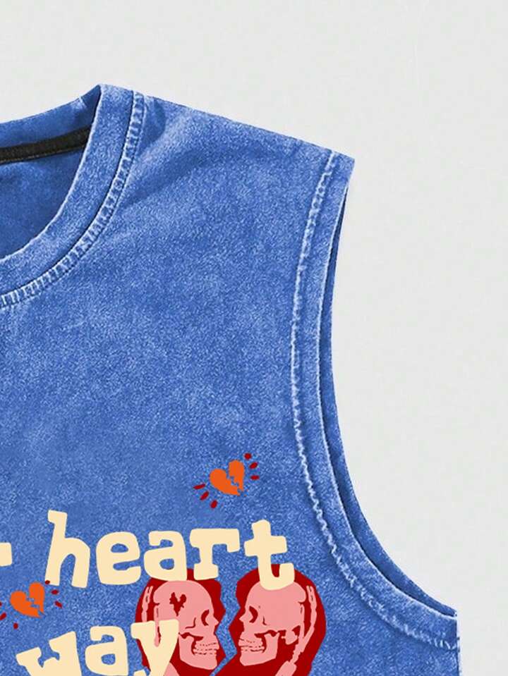 Street Life Men's Washed Crew Neck Sleeveless Casual Skeleton Printed Top, Daily Wear, Halloween