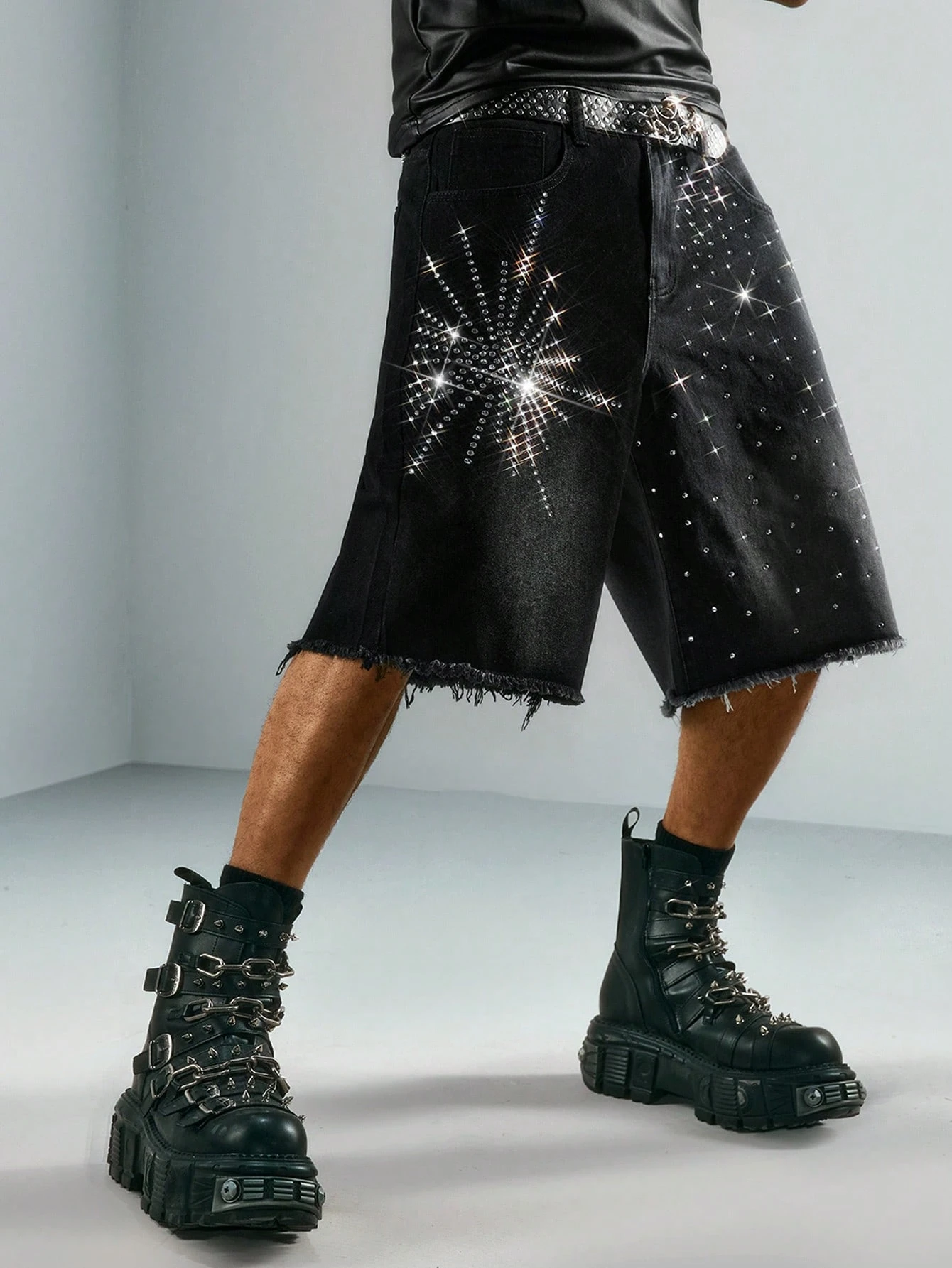 Street Life Spring/Summer Casual Graphic Men'S Contrast Color Rhinestone Pocket Fashionable Versatile Casual Commuting Denim Shorts