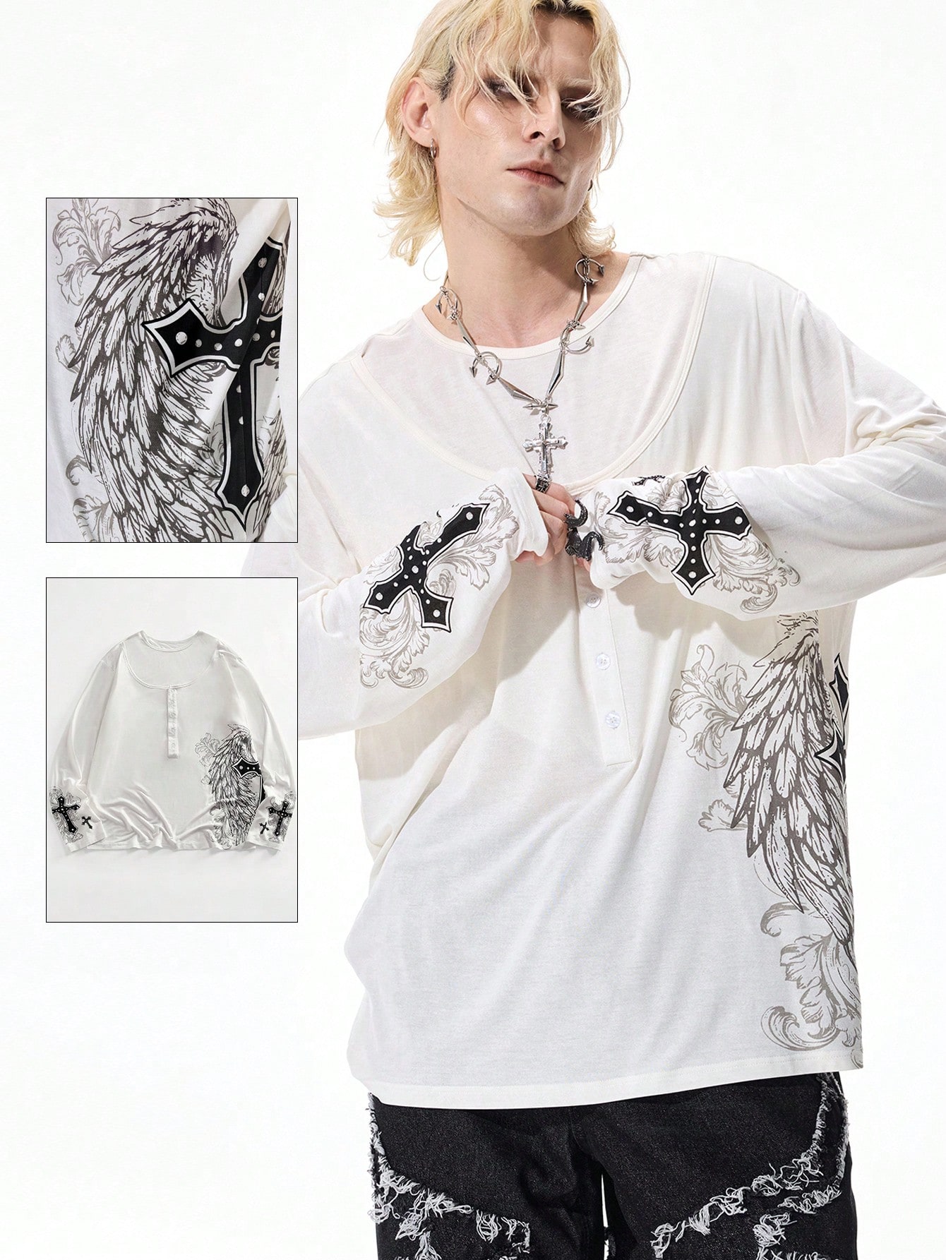 Street Life Spring/Summer Casual Graphic White Men'S Long Sleeve T-Shirt With Wing And Cross Print