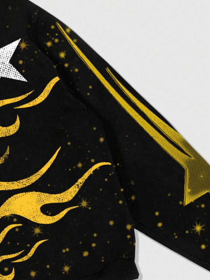 Street Life Teen Boy Casual Flame & Star Print Loose Hoodie, Autumn