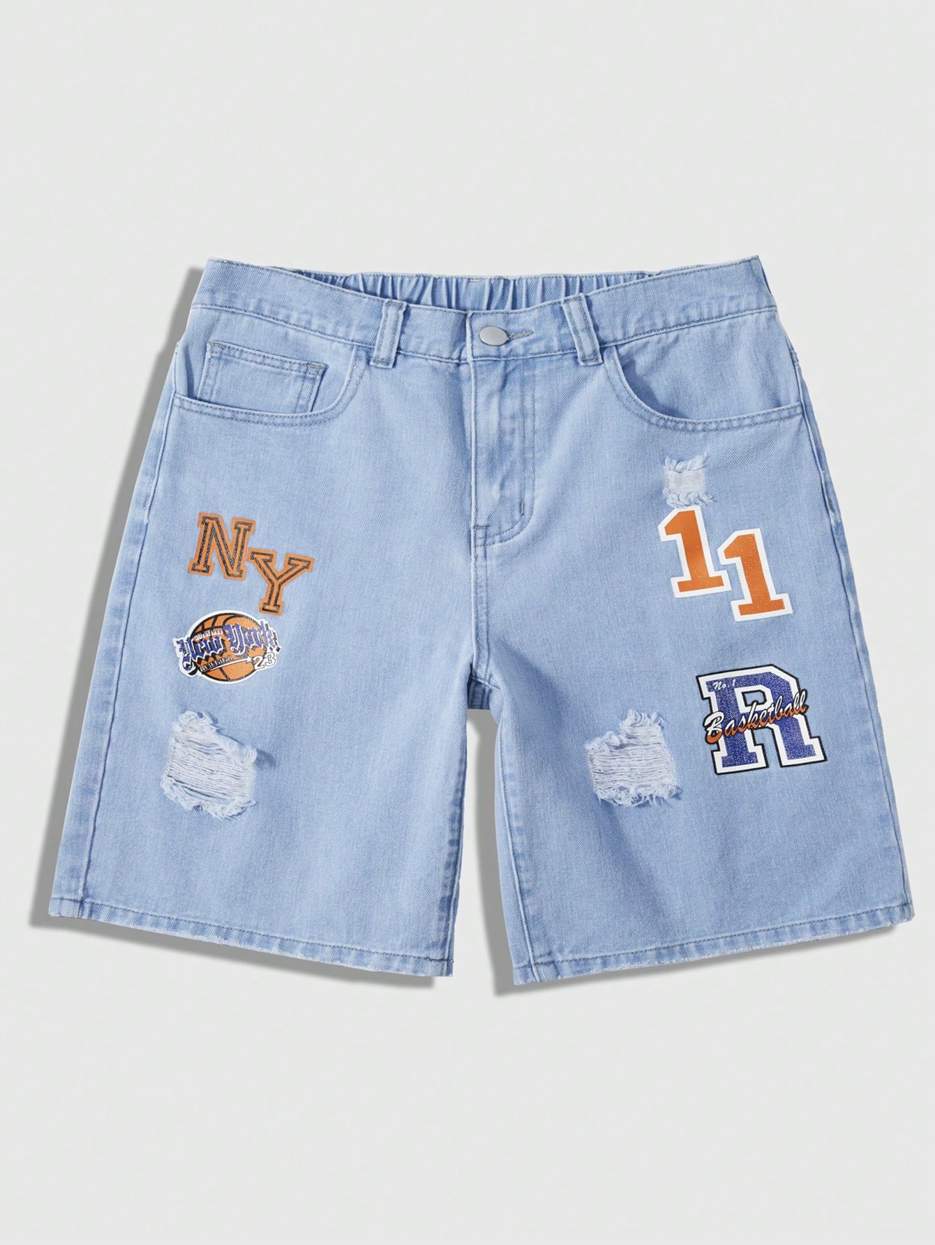 Street Life Teen Boy's Casual Fashion Street Daily Commute Letter & Basketball Print Distressed Denim Shorts, Summer