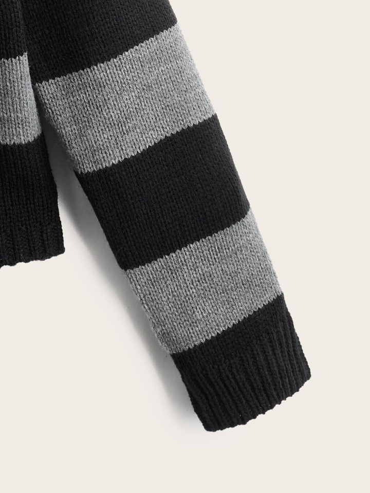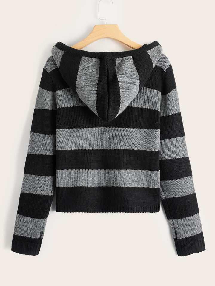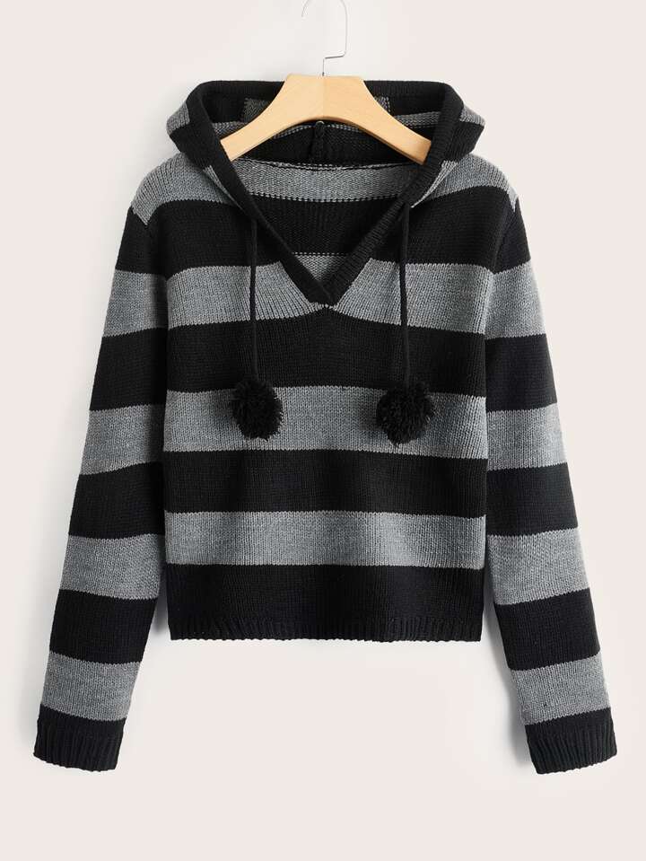 Striped Hooded Pom Pom Sweater