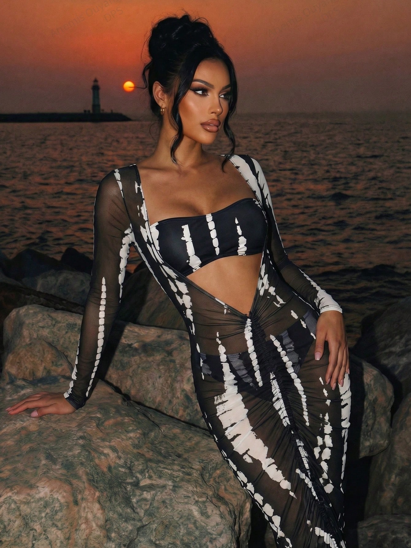Summer Beach Allover Print Bikini Set & Bandeau Top & Bikini & Drawstring Cover Up Dress 3 Piece Bathing Set