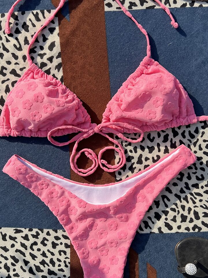 Summer Beach Floral Flocked Bikini Set Halter Triangle Bra & High Cut Bottom 2 Piece Bathing Suit