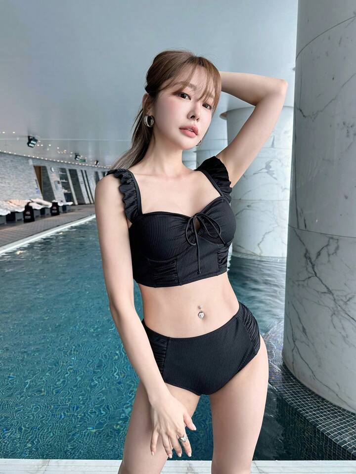 Summer Beach Ribbed Tankini Set Ruffle Trim Tie Front Top & Ruched High Waisted Bottom 2 Piece Bathing Suit