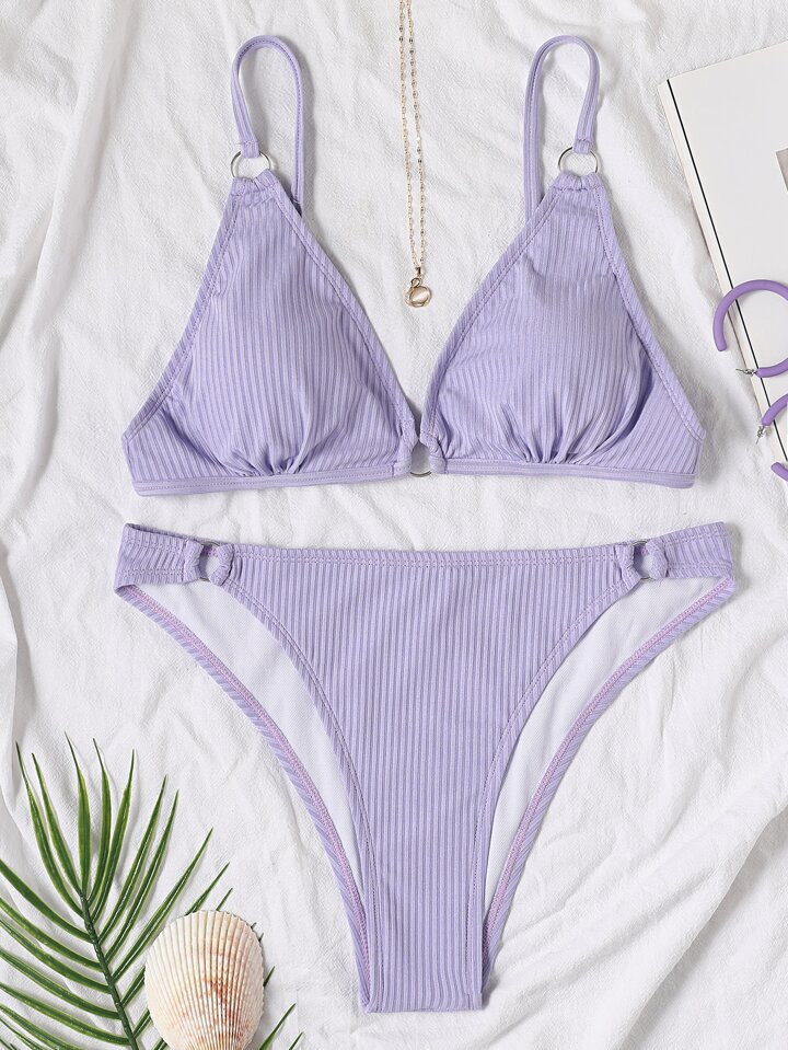 Summer Ribbed Bikini Set Ring Linked Tie Back Bra & High Cut Bottom 2 Pieces Bathing Suit