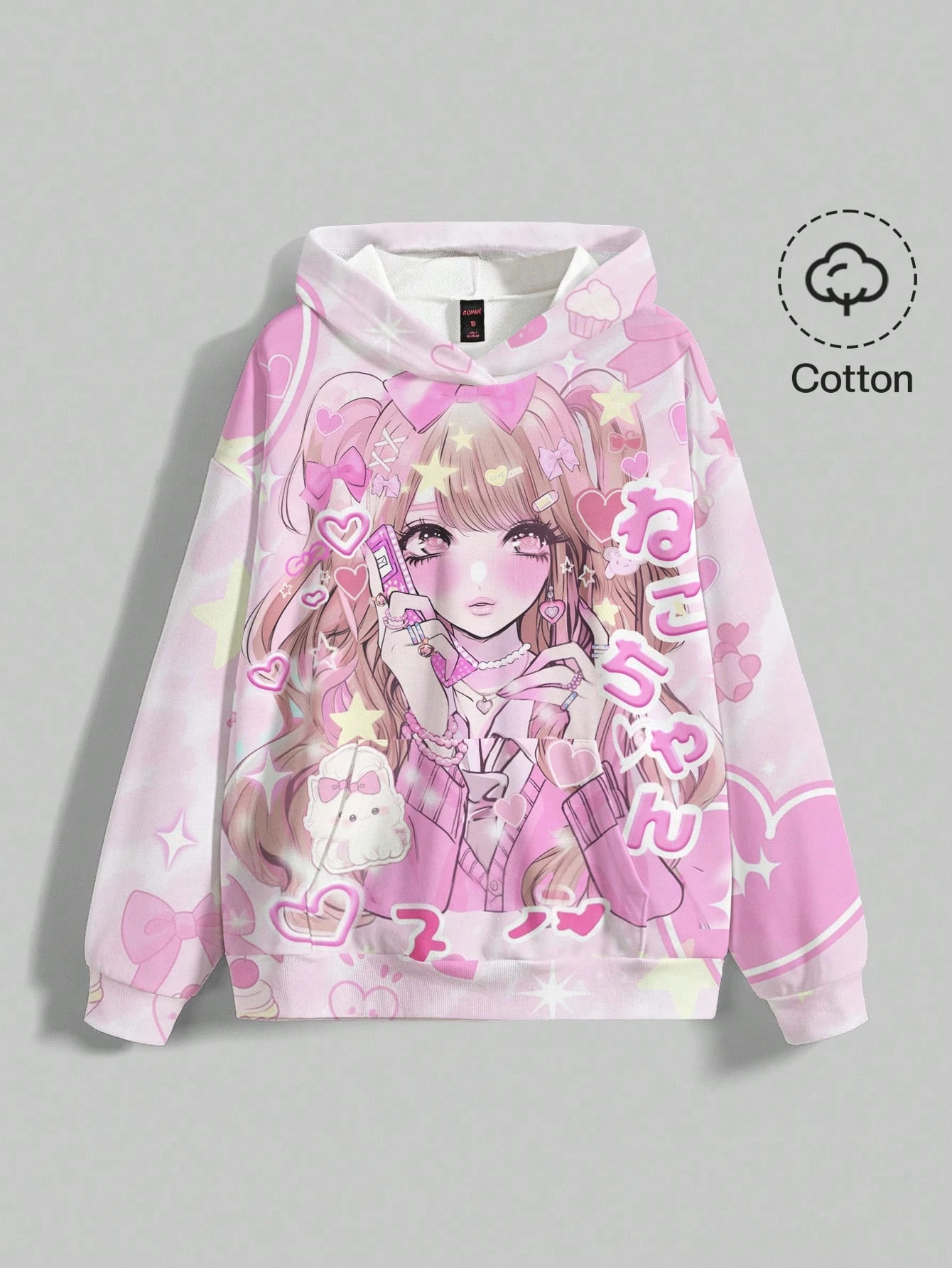 SummergraphicpinkPlus Size Women's Casual Y2K Anime Girl Heart & Japanese Print Loose Fit Drop Shoulder Sweatshirt, Spring/Autumn