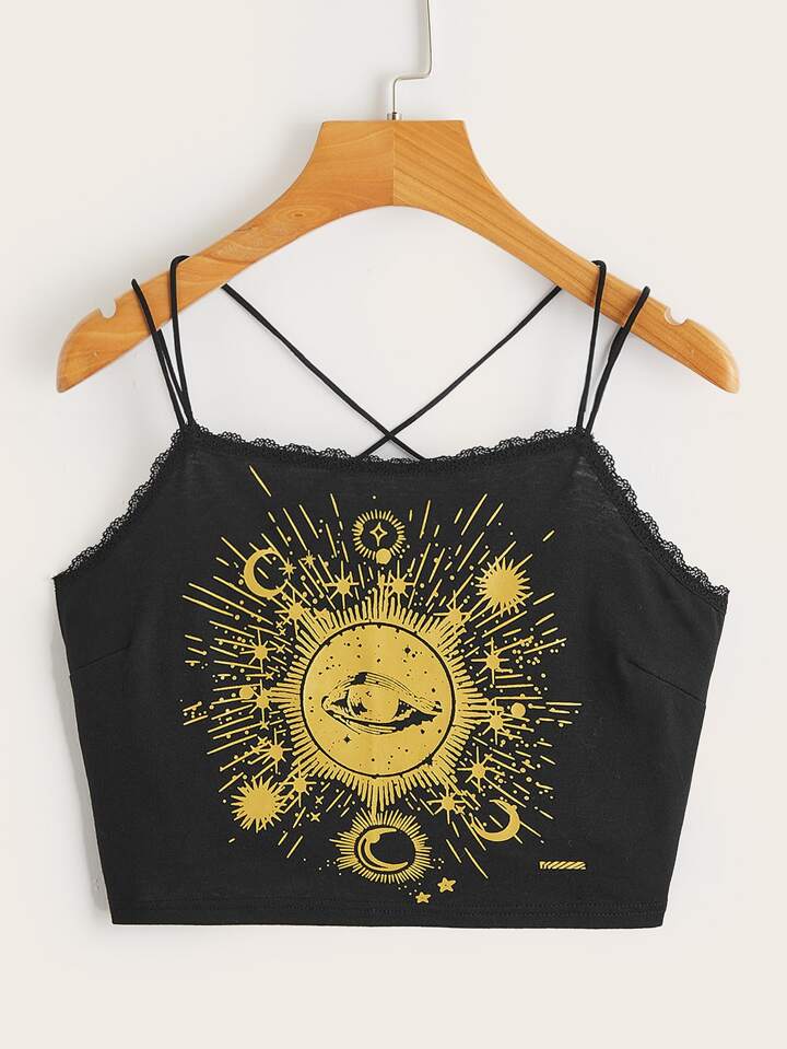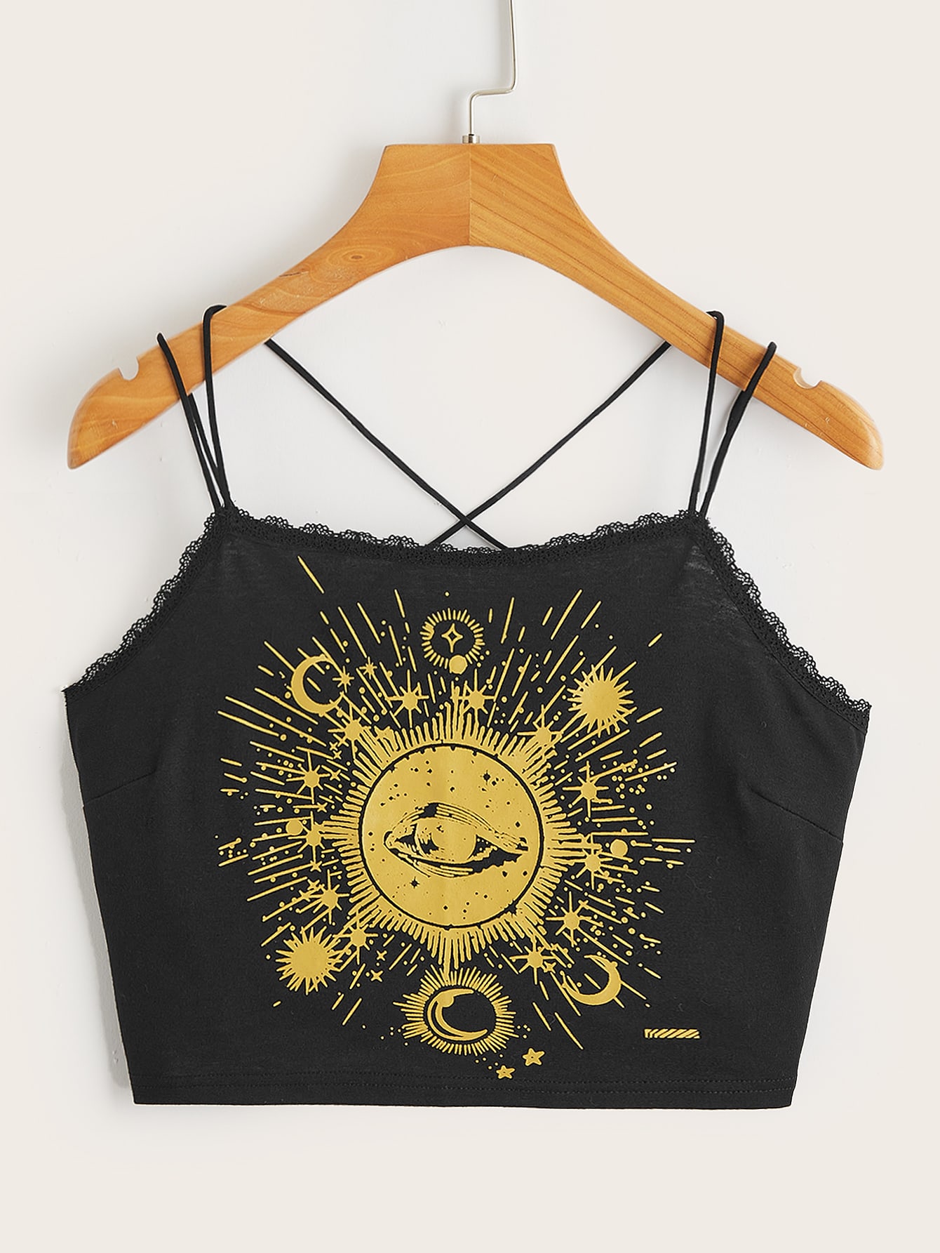 Sun & Moon Graphic Contrast Lace Crop Cami