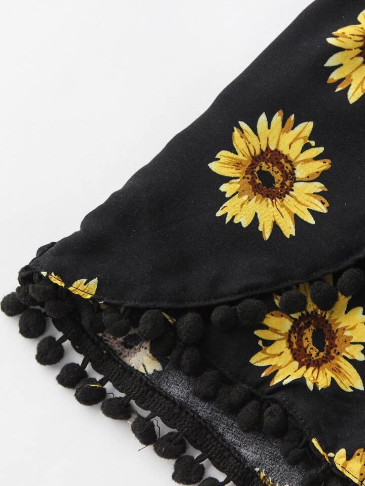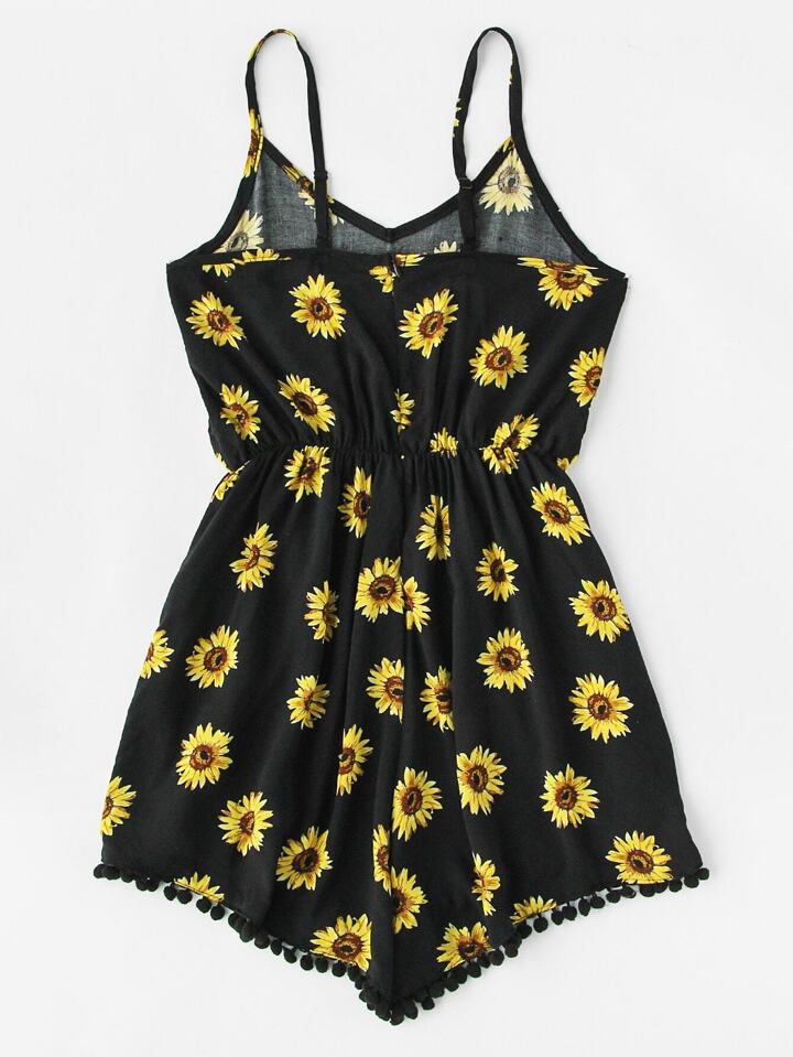 Sunflower Print Pom Pom Trim Cami Romper